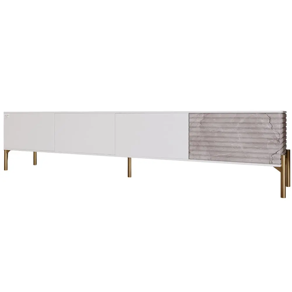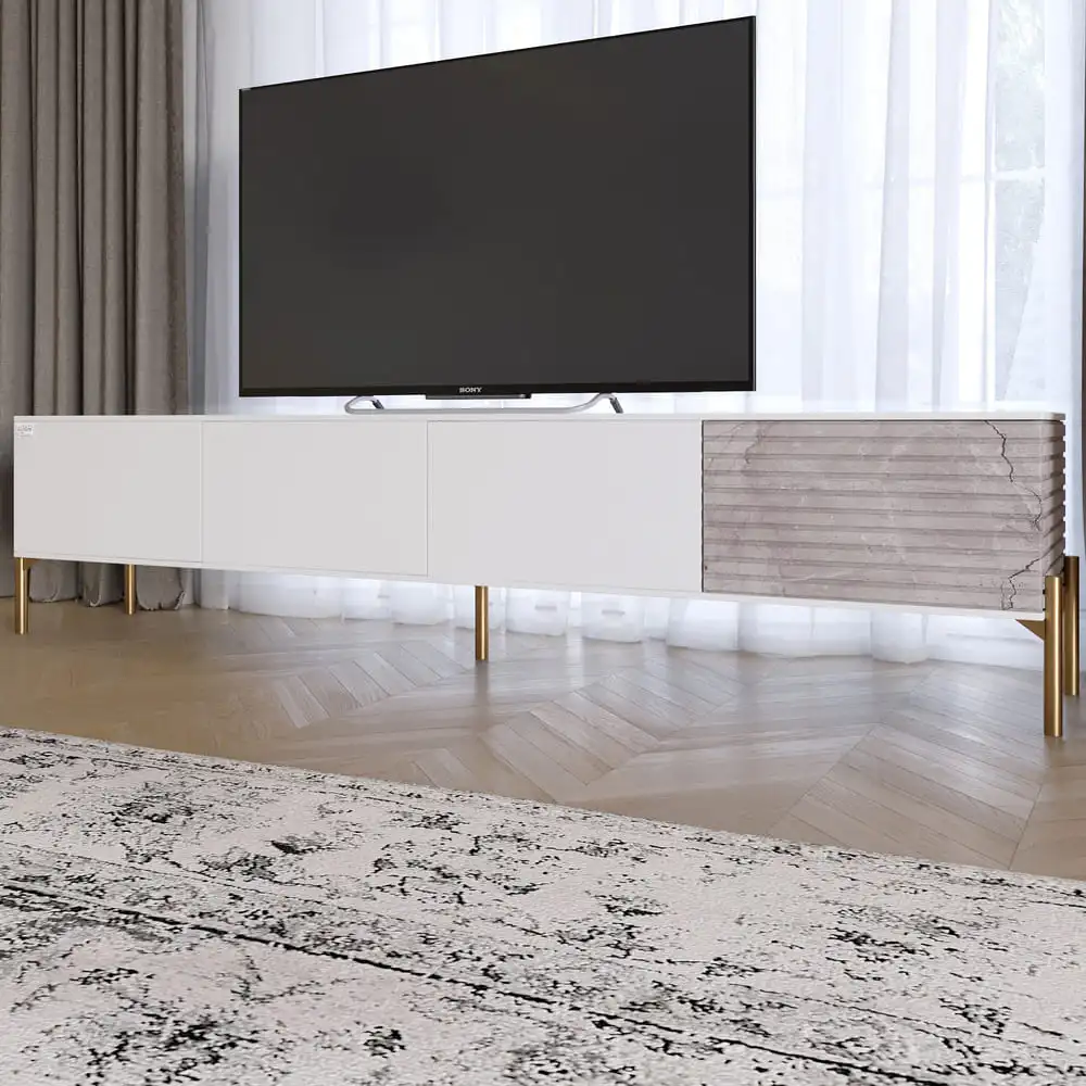 Ваша гостиная заслуживает лучшего, и тумба под телевизор LION станет идеальным дополнением к вашему пространству. Ее современный дизайн с золотыми металлическими ножками привлекает внимание и придает роскошный акцент. Благодаря элегантной цветовой гамме Альба/Камень, эта тумба легко впишется в любой интерьер, подчеркивая ваш стиль и вкус.