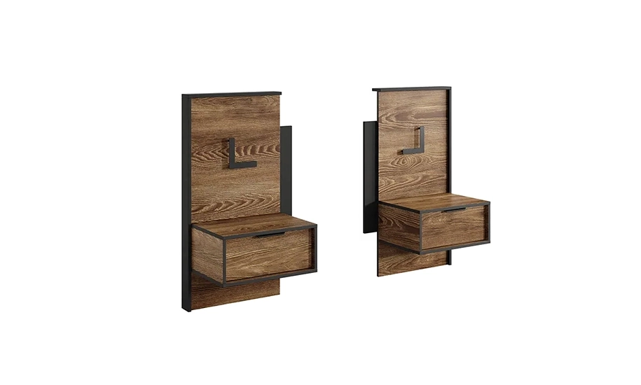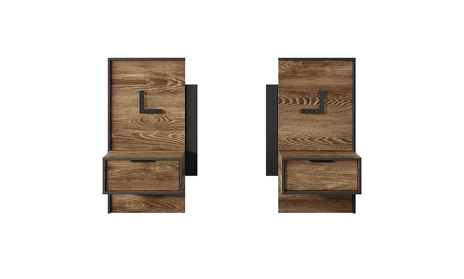 Комплект включає дві тумби та декоративні панелі, що створюють цілісний інтер'єр і підкреслюють акцентну зону біля ліжка.