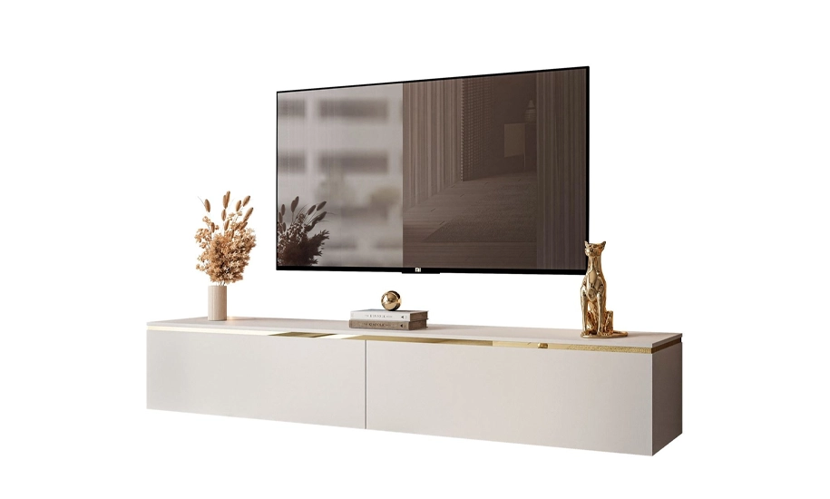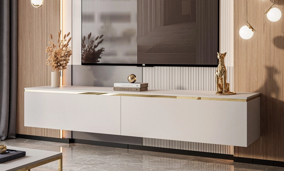 Підвісна тумба під телевізор Аврора у відтінку кашемір із золотими деталями поєднує елегантність і сучасний мінімалізм.