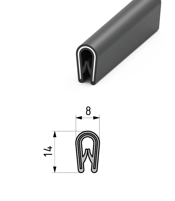 Ущільнювач «Essentra – Mesan» №340.09.522, розміри: висота 14мм, ширина 8мм. Матеріали, що використовуються: сталь, полівінілхлорид. Колір: чорний (ваш колір 100000м). Температурні режими: від -20 до 120. Цей ущільнювач застосовується на виробах завтовшки металу до 3мм і має ребристу поверхню всередині. На замовлення можна змінити температурний режим.