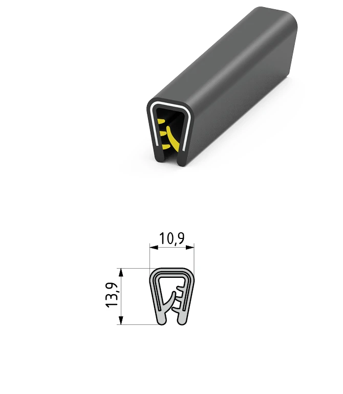 Ущільнювач «Essentra – Mesan» №340.09.527, розміри: висота 13,9 мм, ширина 10,9 мм. Матеріали, що використовуються: сталь, полівінілхлорид. Колір: чорний (всередині жовтий) ( колір від 100000м). Температурні режими: від -20 до 120. Цей ущільнювач застосовується на виробах товщиною металу до 5мм і має ребристу поверхню всередині. На замовлення можна змінити температурний режим.