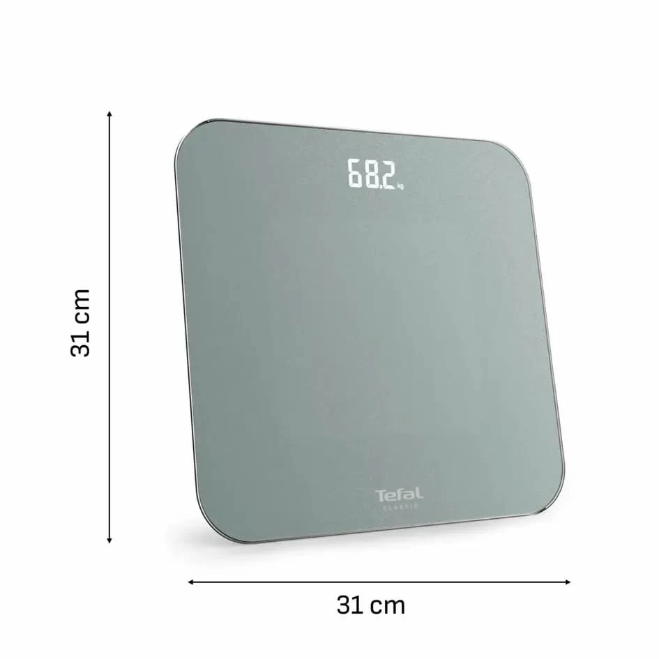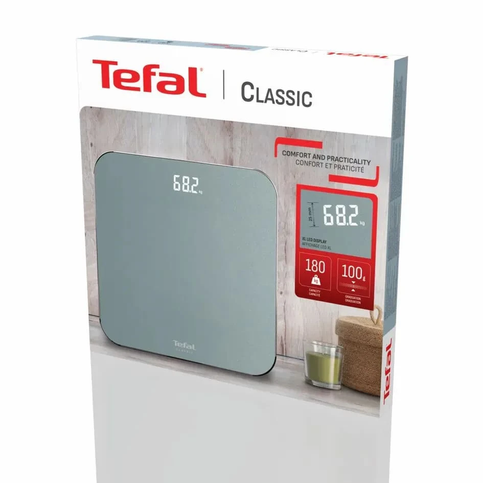 Підлогові ваги Tefal Classic — електронна модель для щоденного контролю маси тіла з платформою із загартованого скла та великим LED-дисплеєм. Діапазон зважування становить до 180 кг з кроком 100 г, є автоматичне увімкнення й вимкнення та вибір одиниць вимірювання. Ультратонкий корпус зручно розміщувати вдома, а батарейки з комплекту дають змогу користуватися вагами одразу після розпакування.