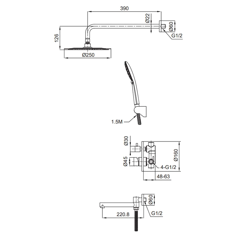 - Комплектация Шланг 150 см, ручна лійка, стельова лійка, тримач для лійки