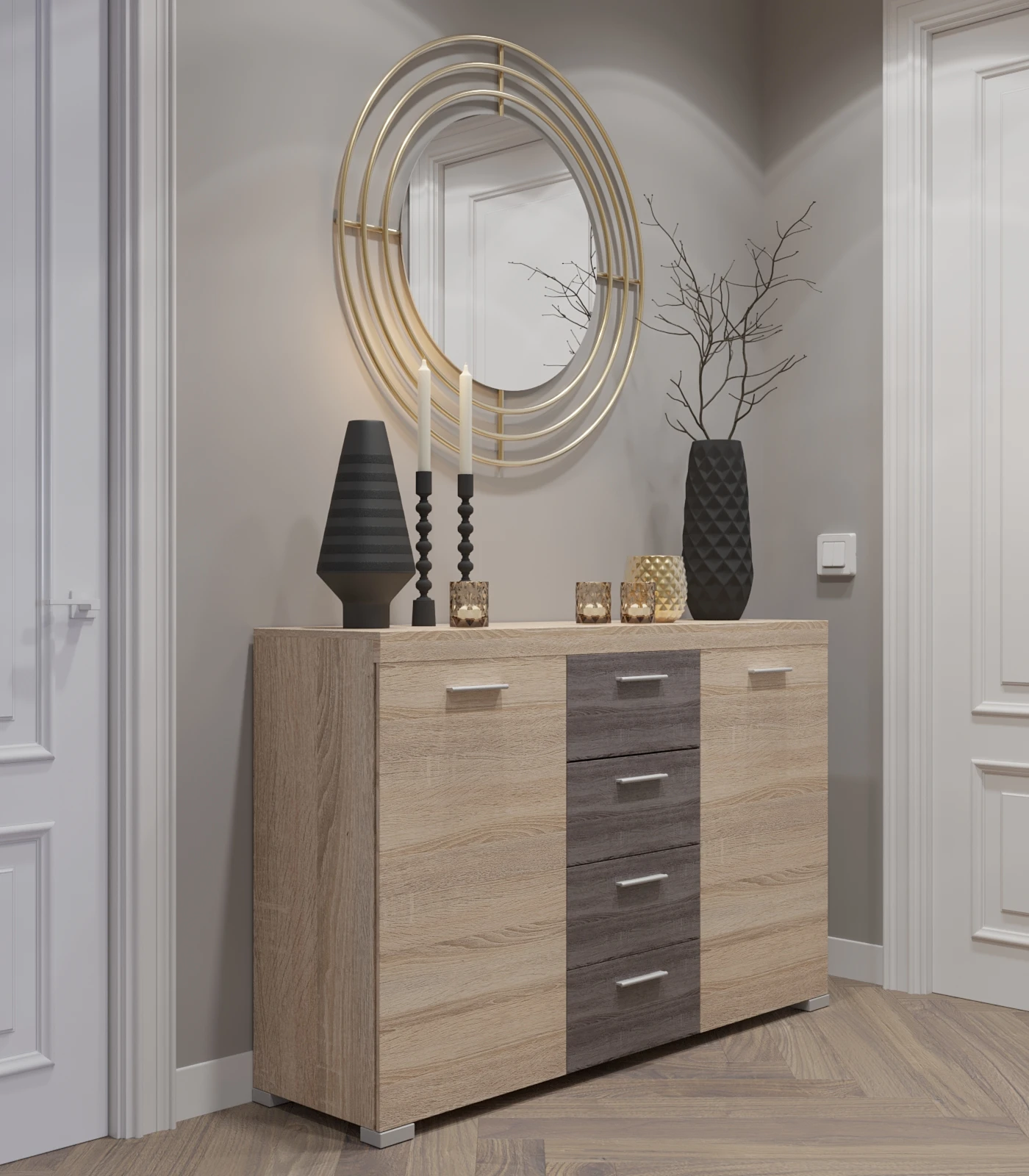 Цей комод ідеально підійде для облаштування спальні, вітальні чи передпокою, додаючи приміщенню елегантності та функціональності. Вибір матеріалів забезпечує легкий догляд за поверхнями, а універсальний дизайн дозволяє використовувати його як для класичного, так і для сучасного стилю інтер'єру.