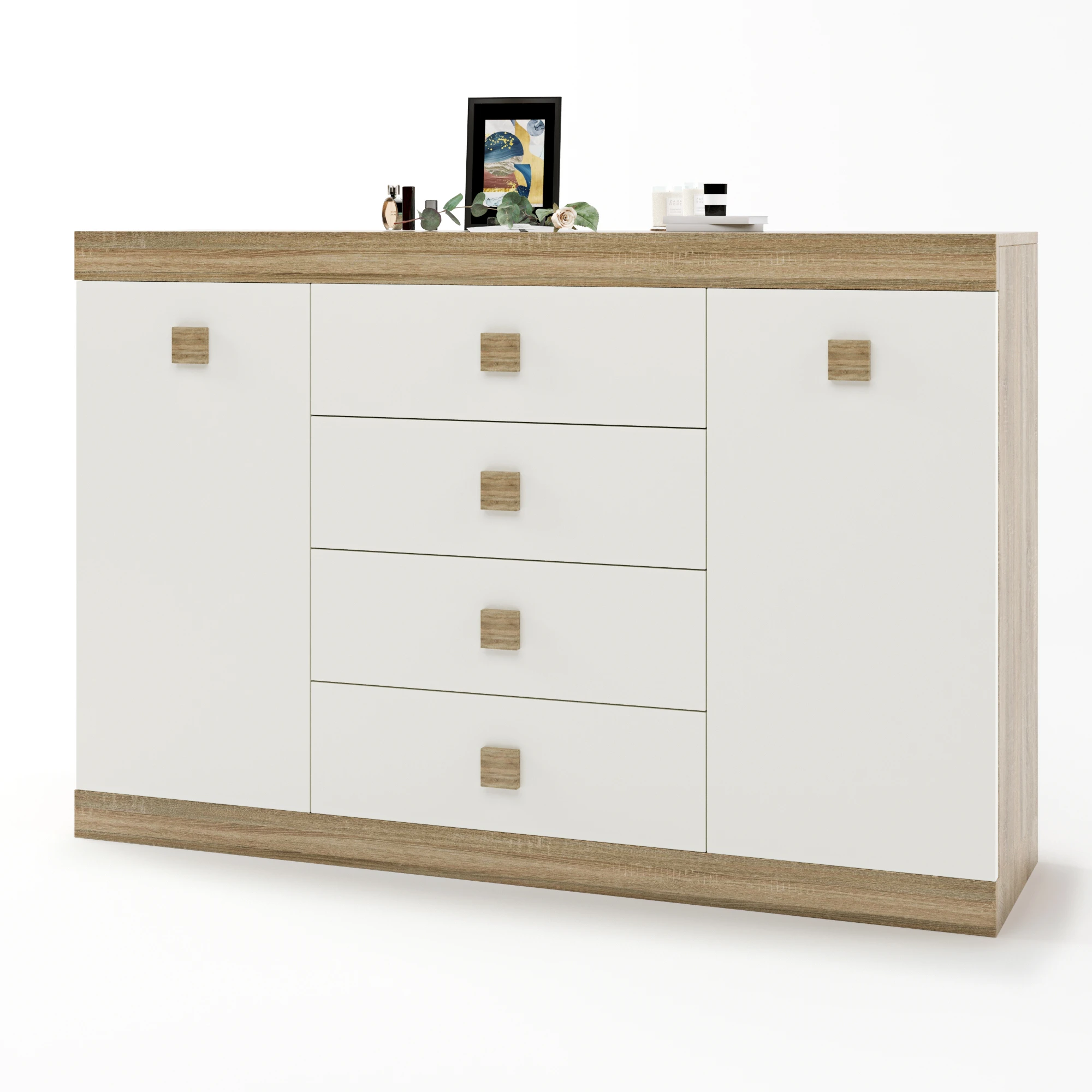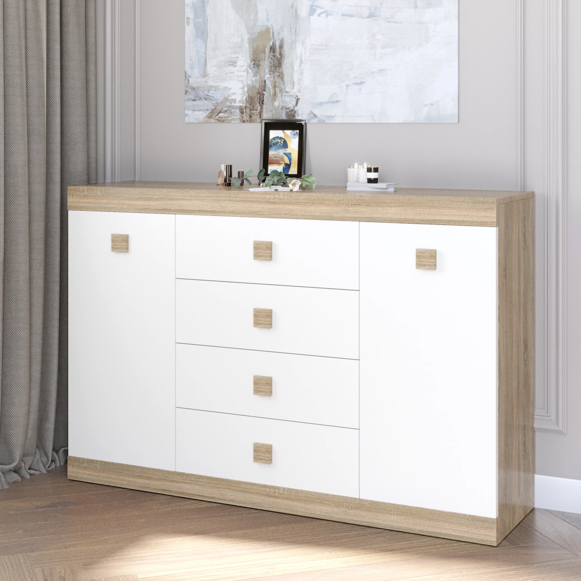 Відкрийте для себе комод Еверест, який стане ідеальним доповненням до вашого дому. Завдяки своїм чотирьом просторам для зберігання, цей комод не лише вражає естетикою, а й забезпечує достатньо місця для всіх ваших речей. Привабливе поєднання дуба сонома та білого кольору надає виробу сучасного вигляду, який гармонійно впишеться в будь-який інтер'єр, від класичного до мінімалістичного.