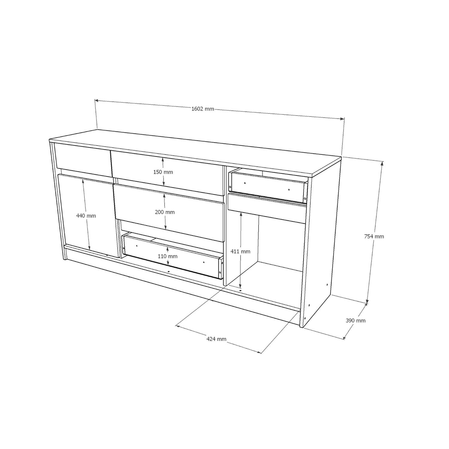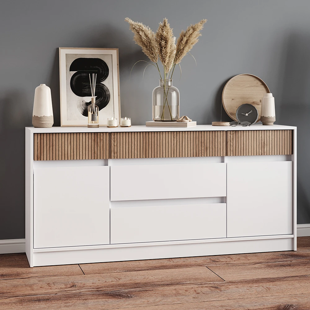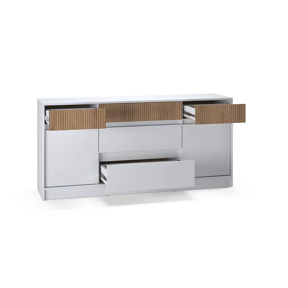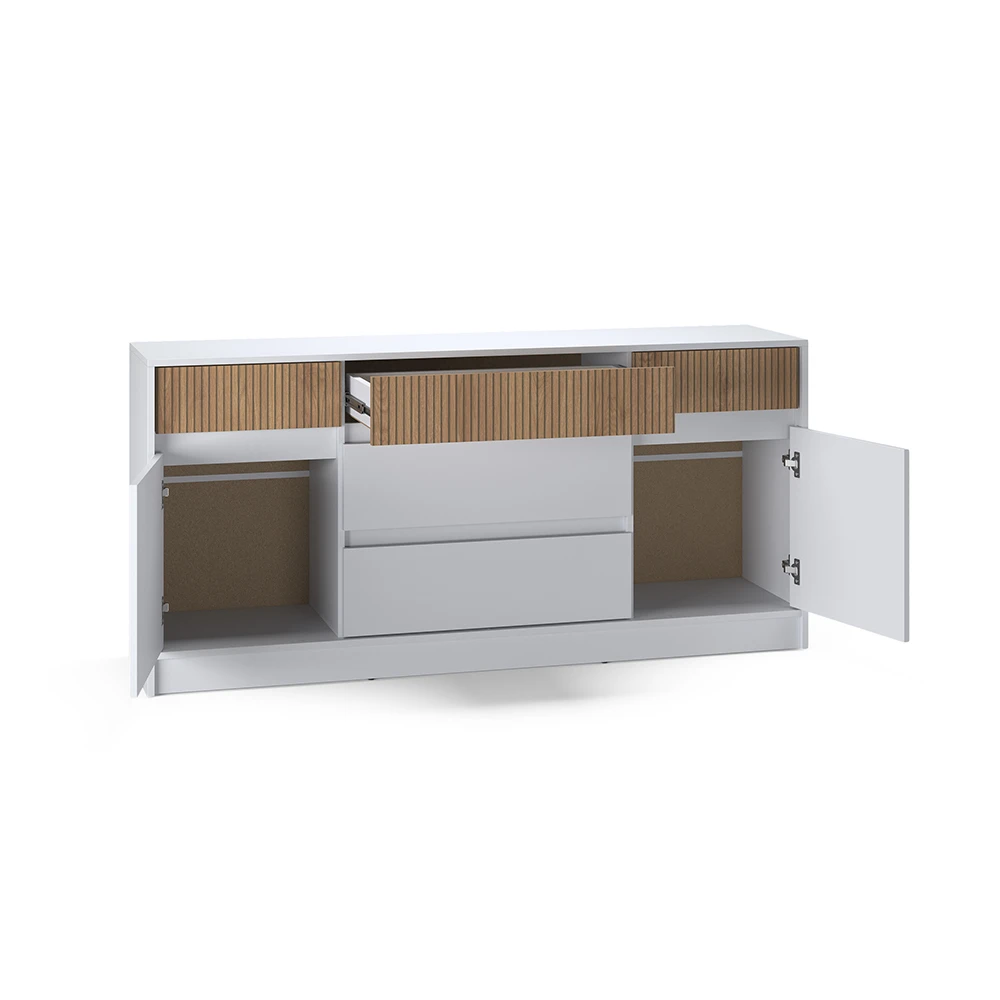 Цей комод розміром 160,2х39х75,4 см пропонує достатньо місця для зберігання речей завдяки своїм зручним дверцятам та шухлядам. Ви зможете організувати свій простір так, як вам зручно, зберігаючи порядок і стиль у вашому домі. Відтепер всі ваші речі завжди будуть під рукою, а кімната виглядатиме охайно та стильно.