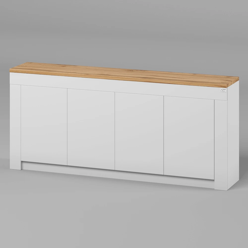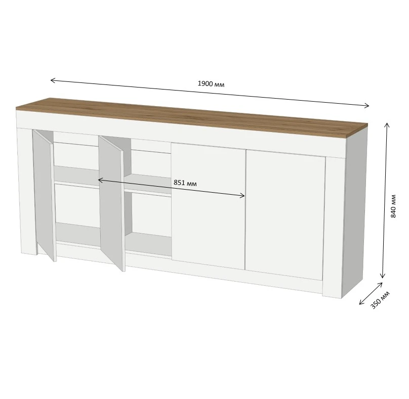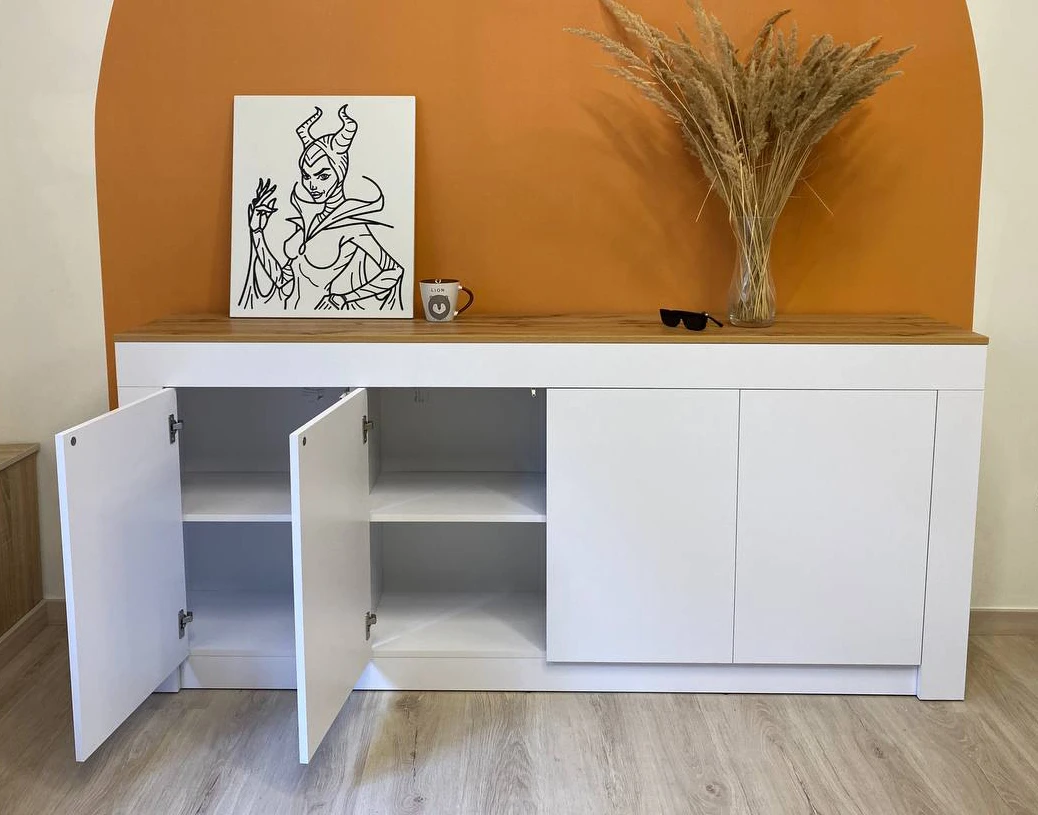 Комод изготовлен из высококачественной ламинированной ДСП от производителя Swiss Krono, что гарантирует износостойкость и длительный срок службы. Конструкция на царгах обеспечивает устойчивость, а четыре дверцы позволяют удобно зонировать внутреннее пространство для хранения разных вещей.