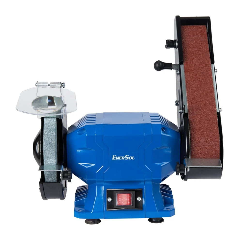 Верстат заточувальний EnerSol EBG-150-50BE поєднує шліфувальний круг діаметром 150 мм та стрічку 50×686 мм для заточування та шліфування. Потужність 250 Вт і швидкість 2990 об/хв забезпечують стабільну роботу з інструментом та деталями. Захисний екран, опорні площадки та гумові ніжки сприяють безпечному та точному використанню.