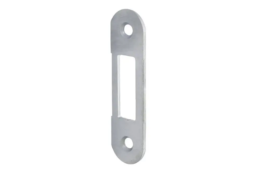 Планка дверного замка. Універсальна, права чи ліва по DIN. Матеріал: сталь. Покриття / колір: хромована матова. Розміри планки замка: Висота: 82 мм. Ширина: 22 мм. Товщина: 2,5 мм. Розмір отвору під ригель замка: 12 х 34 мм.