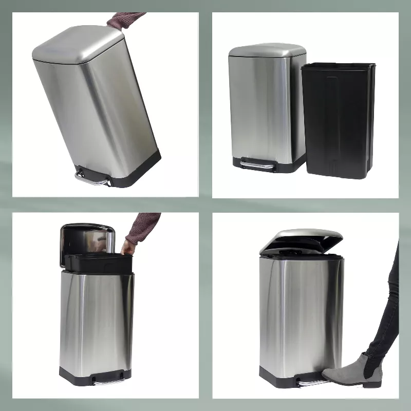 "Баки для мусора с педалью серии Davino вмещают 6 литров. Изготавливаются из нержавеющей стали. Впечатляют своим простым дизайном и функциональностью. Оснащены технологией Silent Close, т.е. крышка при закрытии не просто падает вниз, а она закрывается плавно и тихо. этом положении, и вы сможете вынуть внутренний контейнер, чтобы опорожнить его. Затем вы можете опустить крышку, и она снова закроется.