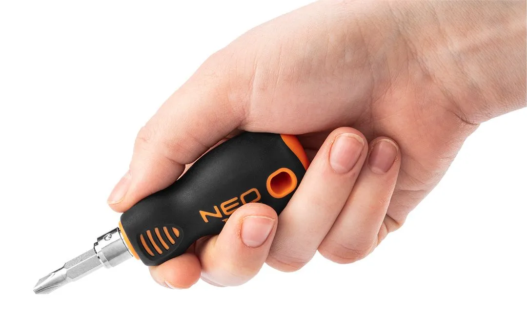 Викрутка переставна "бочка" NEO з руків'ям і двостороннім наконечником (шліцьовим, хрестовим). Магнітні наконечники виготовлені з надзвичайно міцної хромомолібденової сталі. Зручне двокомпонентне руків'я стійке до впливу хімічних речовин, масел і мастил. Надійність продукту підтверджує 25-річна гарантія. Бренд NEO виправдовує очікування професіоналів.