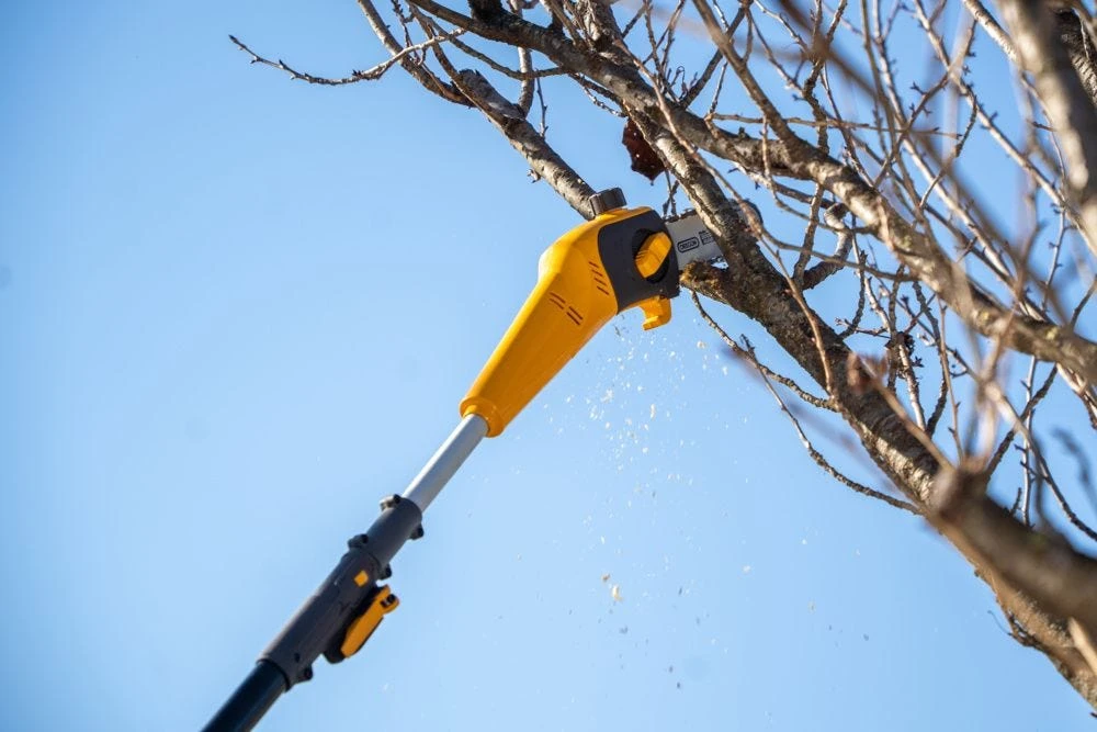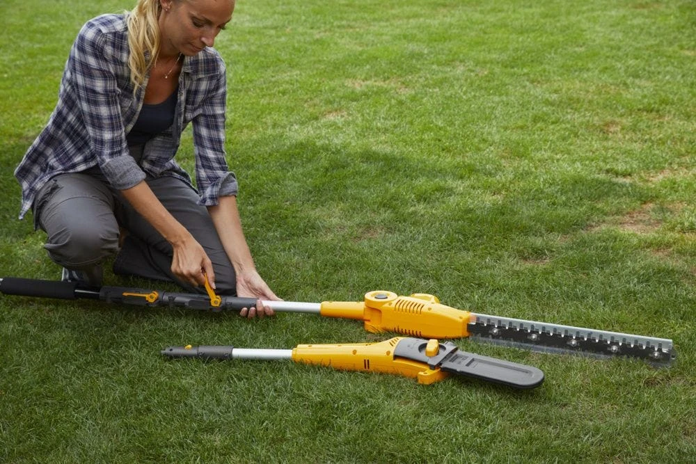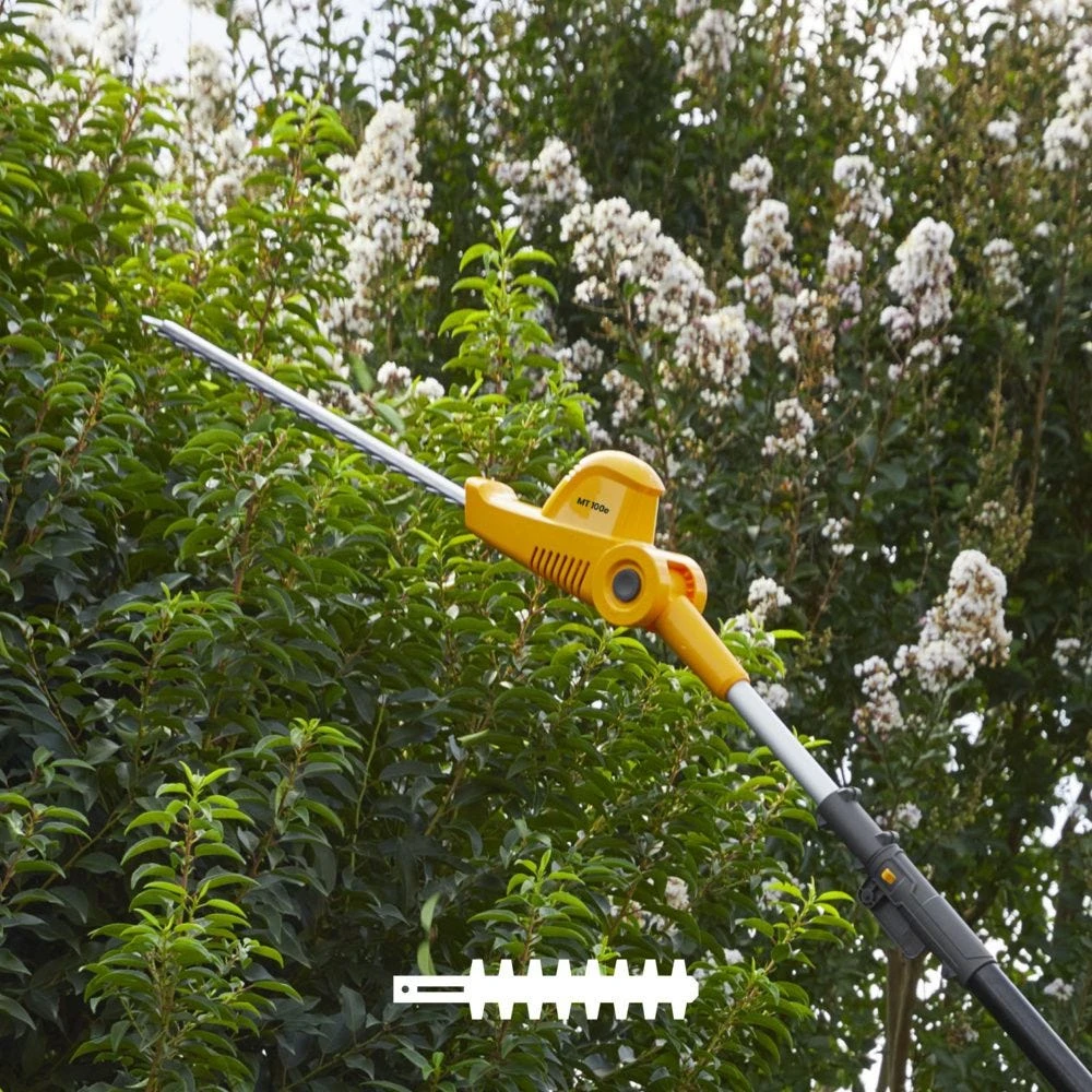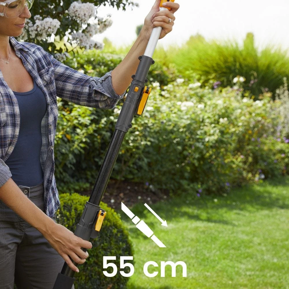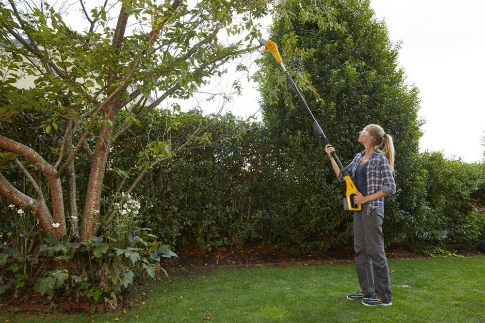 Акумуляторний висоторіз-кущоріз STIGA MT100eKit працює від батареї 20 В ємністю 4 А·год і поєднує дві функції в одному інструменті. Шина 20 см з ланцюгом 3/8" і швидкістю 5 м/с дозволяє підрізати гілки на висоті, а ріжучий модуль кущоріза справляється з гілками до 18 мм. Телескопічна штанга регулюється від 55 до 275 см. Вага 4,67 кг зберігає зручність керування. До комплекту входять акумулятор і зарядний пристрій.