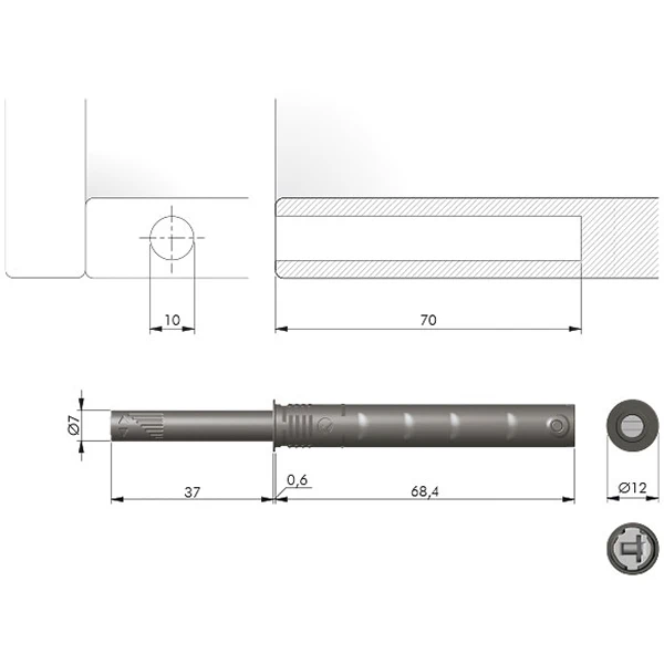 Выталкиватель Italiana Ferramenta K-Push Tech длиной 37 мм - это инновационное решение для создания современной мебели без ручек. Благодаря магнитному механизму, этот аксессуар обеспечивает надежное открывание фасадов при легком нажатии, добавляя вашему интерьеру минималистичности и функциональности.