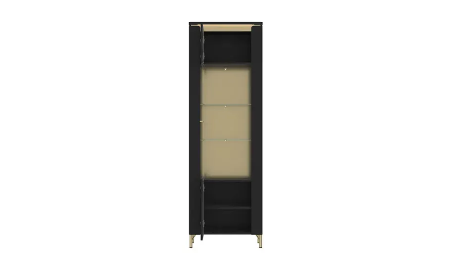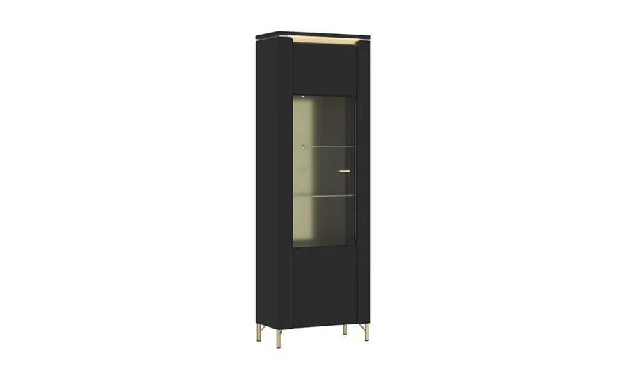 Однодверна вітрина Norica — це елегантний елемент для стильних інтер'єрів, який поєднує сучасний дизайн і функціональність. Її частково засклений фасад з загартованим склом та металеві деталі в золотистому кольорі створюють розкішну атмосферу. Вітрина стане відмінним вибором для вітальні чи їдальні, підкреслюючи вишуканість простору. Окрім своєї естетичної цінності, вона оснащена безшумними петлями та конструктивним підсвічуванням, що додає їй ще більшого шарму.