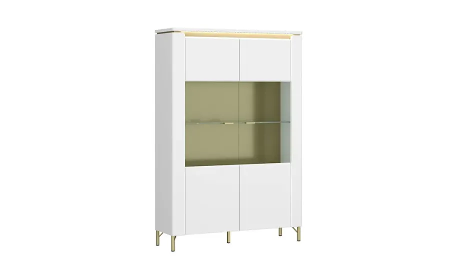 Дводверна висока вітрина з колекції Lazio – це поєднання сучасного дизайну та елегантної розкоші, що доповнить інтер'єр вашої вітальні чи їдальні. Її стильна біла колірна гамма з золотими елементами та сучасним підсвічуванням підкреслює розкіш та функціональність.