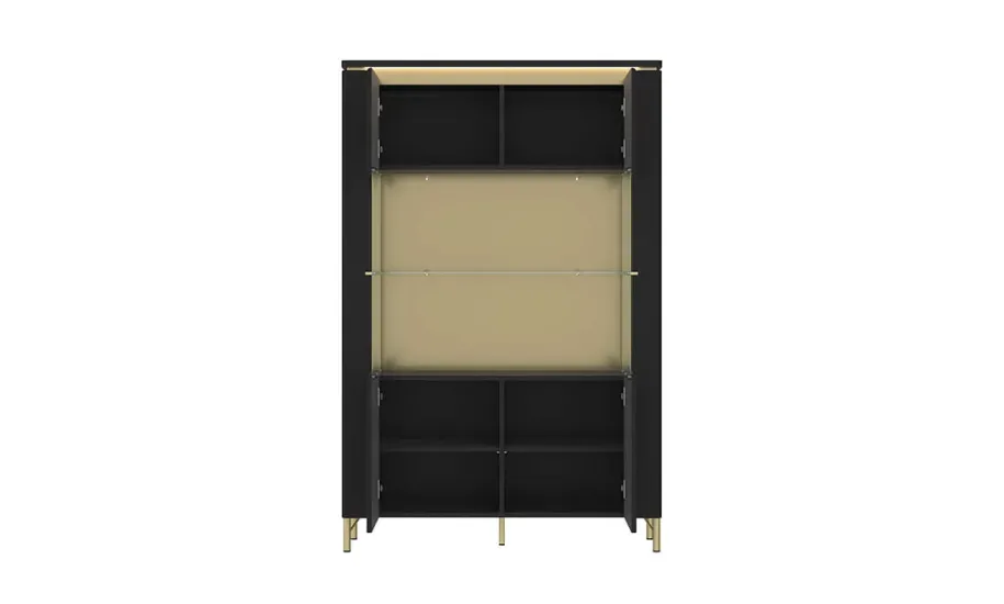 Дводверна вітрина Norica — це ідеальний елемент для створення стильного та елегантного інтер'єру вітальні чи їдальні. Витончене поєднання чорного матового та золотого кольорів, разом з частково заскленими фасадами з загартованого скла, надає меблям розкішного вигляду. Вітрина обладнана сучасними металевими ручками золотистого відтінку та високими металевими ніжками, що підкреслюють її елегантність. Вбудоване світлодіодне підсвічування створює приємну атмосферу, а можливість додаткового освітлення дає можливість налаштувати світлову композицію за вашим бажанням.