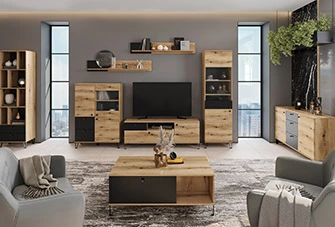 Фасади вітрини виготовлені з МДФ товщиною 16 мм та покриті матовою плівкою ПВХ, кольори - дуб больцано та чорний софтач. Металева ручка, виконана в стилі ретро, додає вітрині шарму та стильності. Механізм шухляд - направляюча телескопічна повного висування, що забезпечує легкий доступ до збережених предметів.