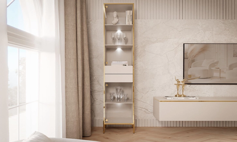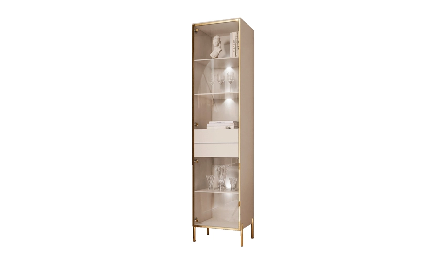 Дводверна вітрина Аврора у відтінку кашемір поєднує в собі витонченість сучасного дизайну та практичність щоденного використання. Її скляний фасад із м'яким підсвічуванням і тонкими золотими акцентами створює відчуття легкості та елегантності, а теплий колір кашеміру надає простору спокою й гармонії.