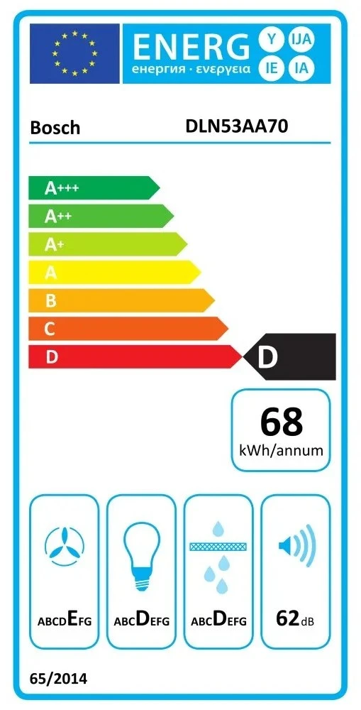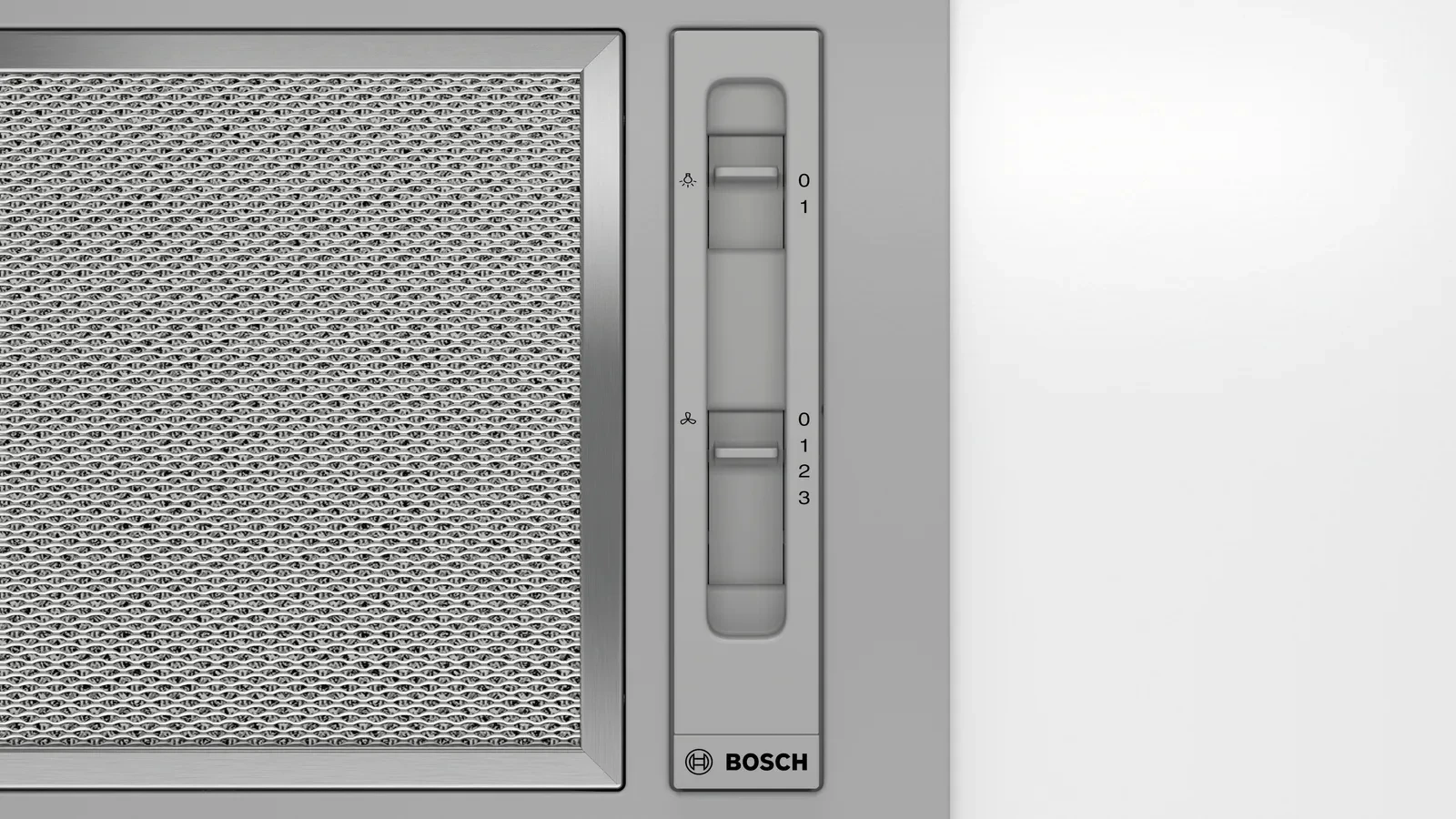 Вбудована витяжка Bosch DLN53AA70 працює у режимах відведення та рециркуляції, для останнього потрібен окремий комплект. Повзунковий перемикач дозволяє обирати 3 рівні потужності та керувати освітленням, а металевий жиропоглинаючий фільтр придатний для миття в посудомийній машині. Для запобігання зворотній тязі передбачено зворотний клапан.