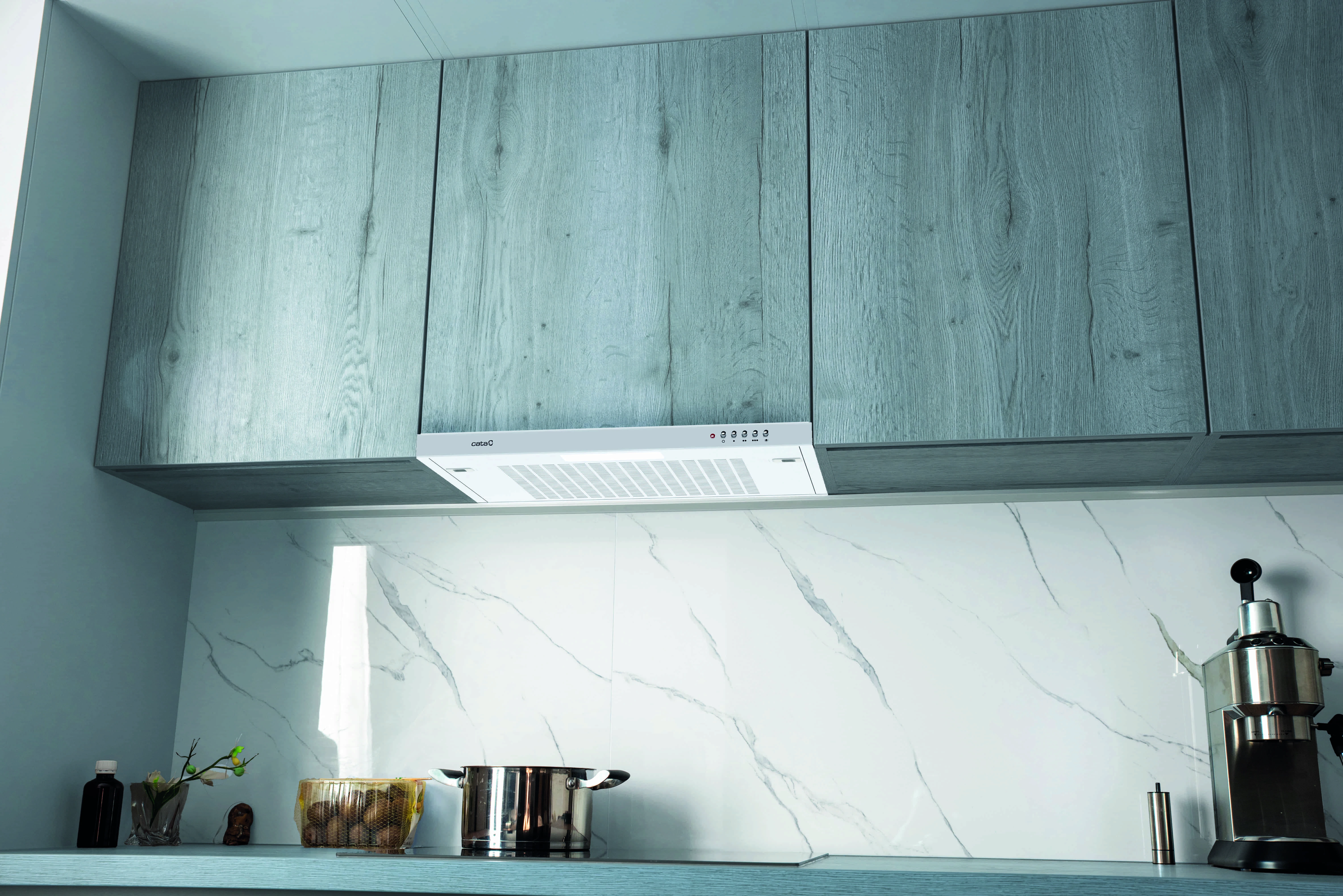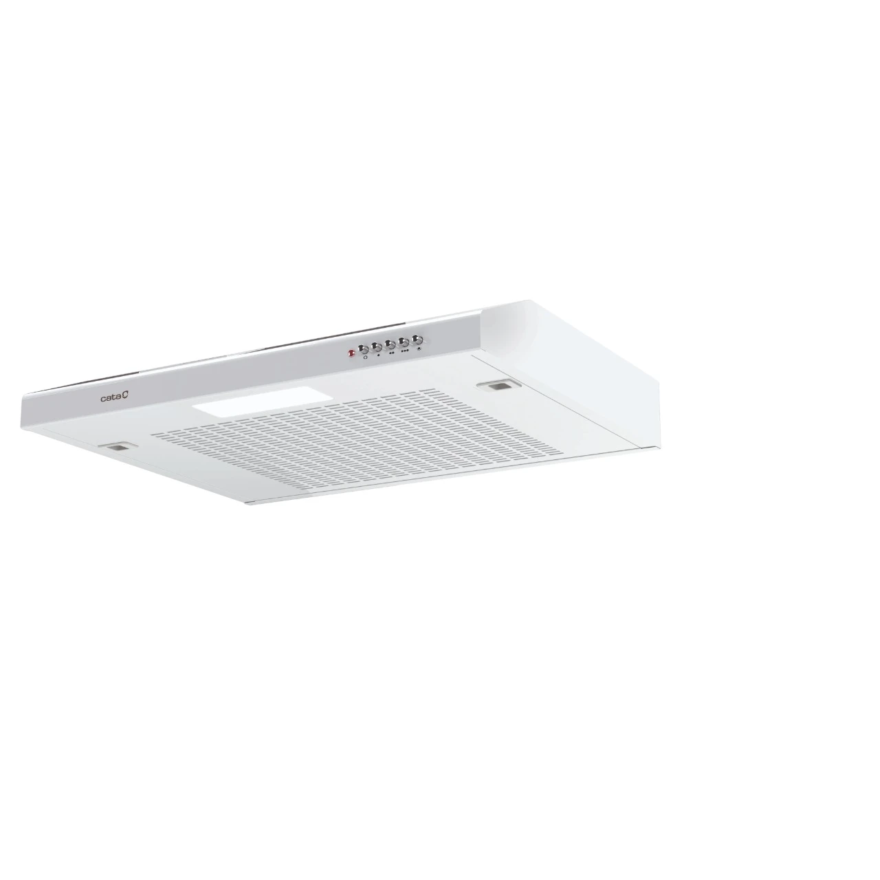 Cata LFK 6001 Wh (02011112) — плоска витяжка шириною 60 см у білому корпусі. Продуктивність до 350 м³/год, 3 рівні потужності, механічне кнопкове керування, алюмінієвий фільтр, LED-освітлення. Клас енергоефективності B, мінімальна відстань до плити 650 мм, діаметр виходу 120 мм. Працює в режимі відведення або рециркуляції (з вугільним фільтром окремо). Бюджетне рішення для невеликих і середніх кухонь.