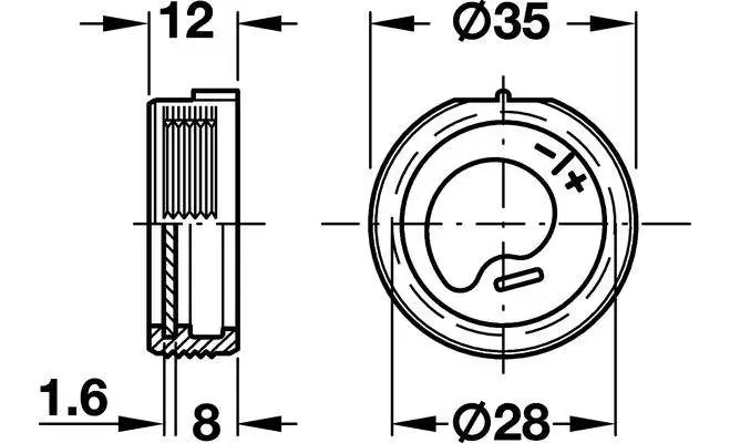 Врізний підвіс для дзеркал, панелей тощо, з регулюванням по висоті ±3 мм через ексцентриковий диск зі сталі. Корпус підвісу виготовлений з пластмаси чорного кольору, пластина виготовлена з оцинкованої сталі. Монтаж врізного підвісу виконується шляхом запресовуваня. Параметри підвісу: зовнішній діаметр/внутрішній діаметр/глибина свердління- 35/28/12 мм, несуча здатність- 25 кг.