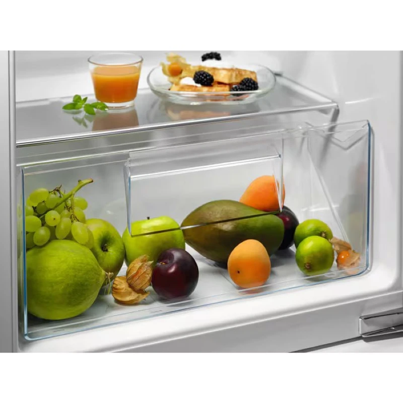 Вбудована холодильна камера Electrolux LRB2AE88S забезпечує зручне зберігання продуктів завдяки концепції OptiSpace — продуманому розташуванню полиць і ящиків для ефективного використання простору. Прозорий ящик для овочів у всю ширину дозволяє комфортно розміщувати габаритні продукти. Полки з міцного безпечного скла легко очищуються, а автоматичне розморожування холодильної камери спрощує догляд. Механічне керування температурою забезпечує надійну та просту експлуатацію.