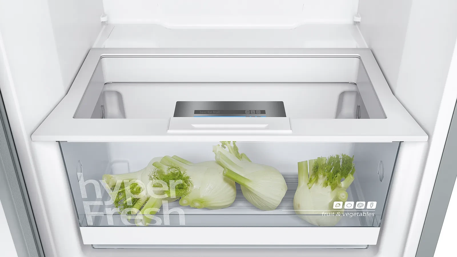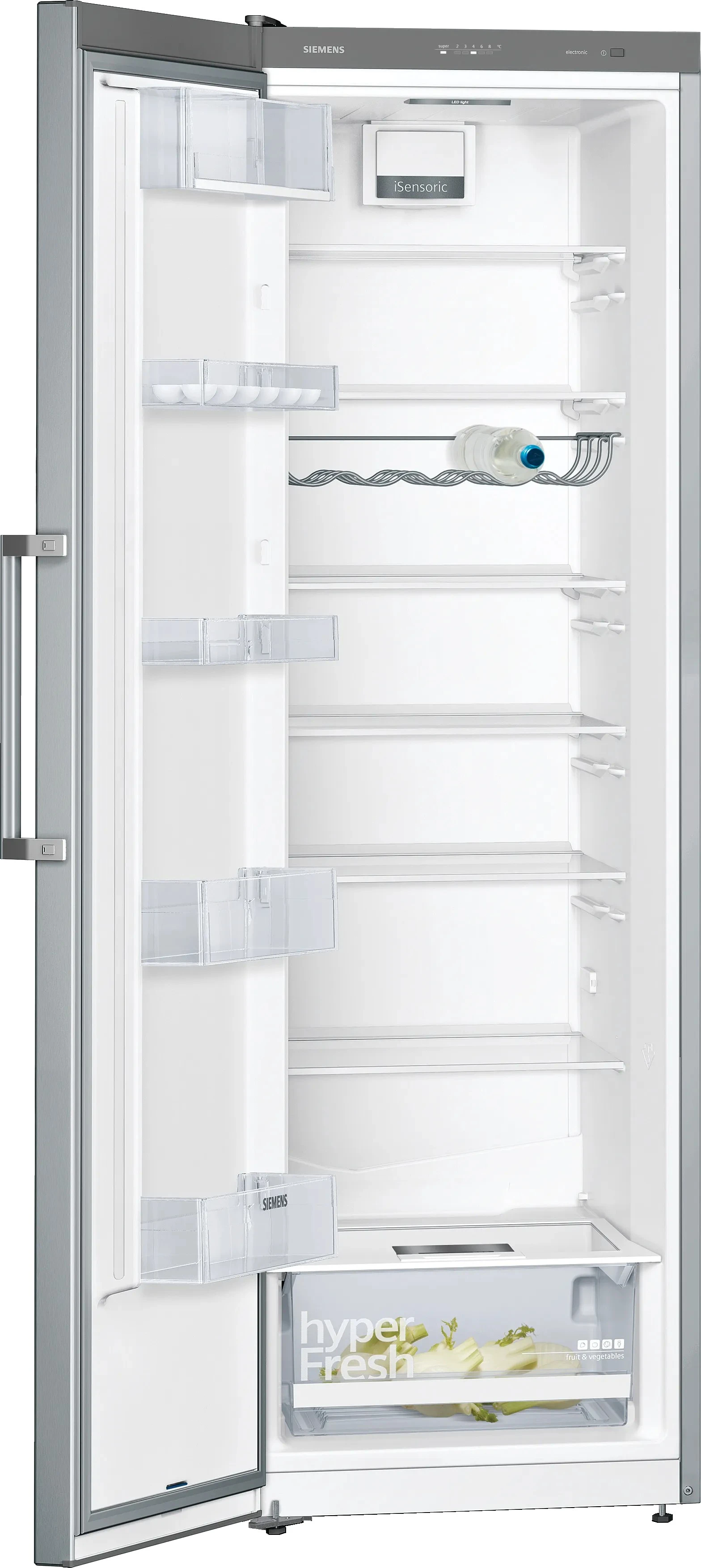 Холодильна камера Siemens з оздобленням під нержавіючу сталь та покриттям antiFingerprint має містке холодильне відділення з великим ящиком hyperFresh для фруктів та овочів. Рівномірне LED-освітлення, решітка для пляшок і функція швидкого охолодження допомагають зручно організувати продукти та підтримувати стабільну температуру. Міцні полиці safetyGlass забезпечують надійну опору для різних типів продуктів і легко очищуються.