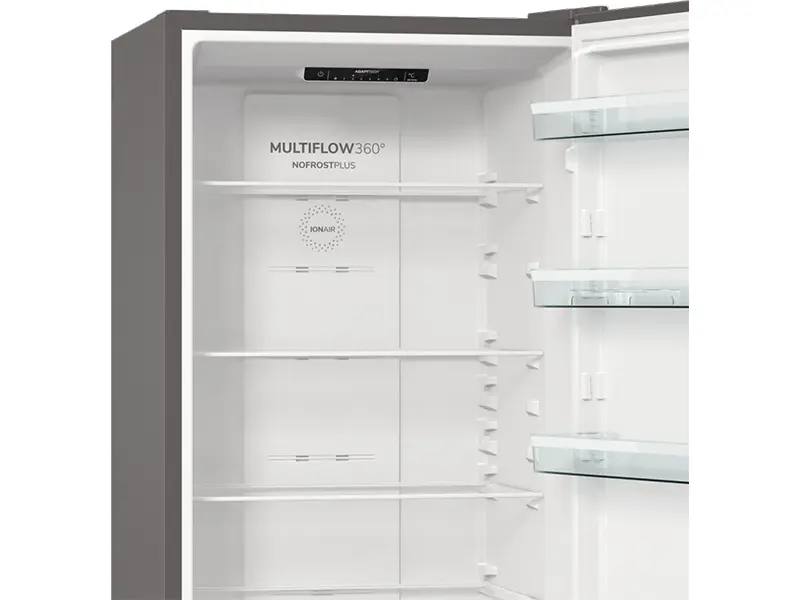 Технологія IonAir створює негативно заряджені іони в приладі, які рівномірно розподіляються в холодильній камері за допомогою нової системи MultiFlow 360°. Збагачене цими аніонами повітря сприяє збереженню аромату продуктів і усуває неприємні запахи.