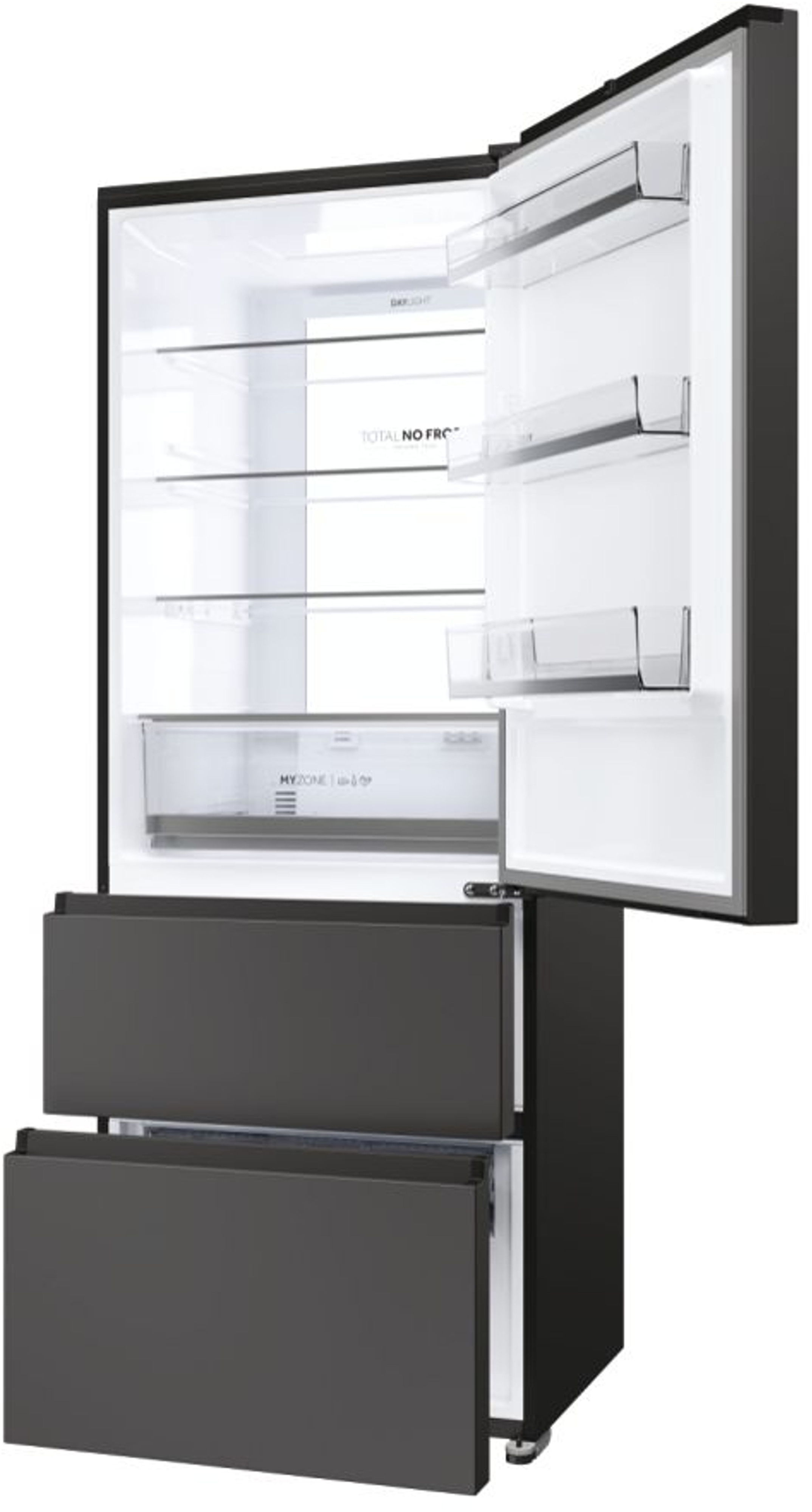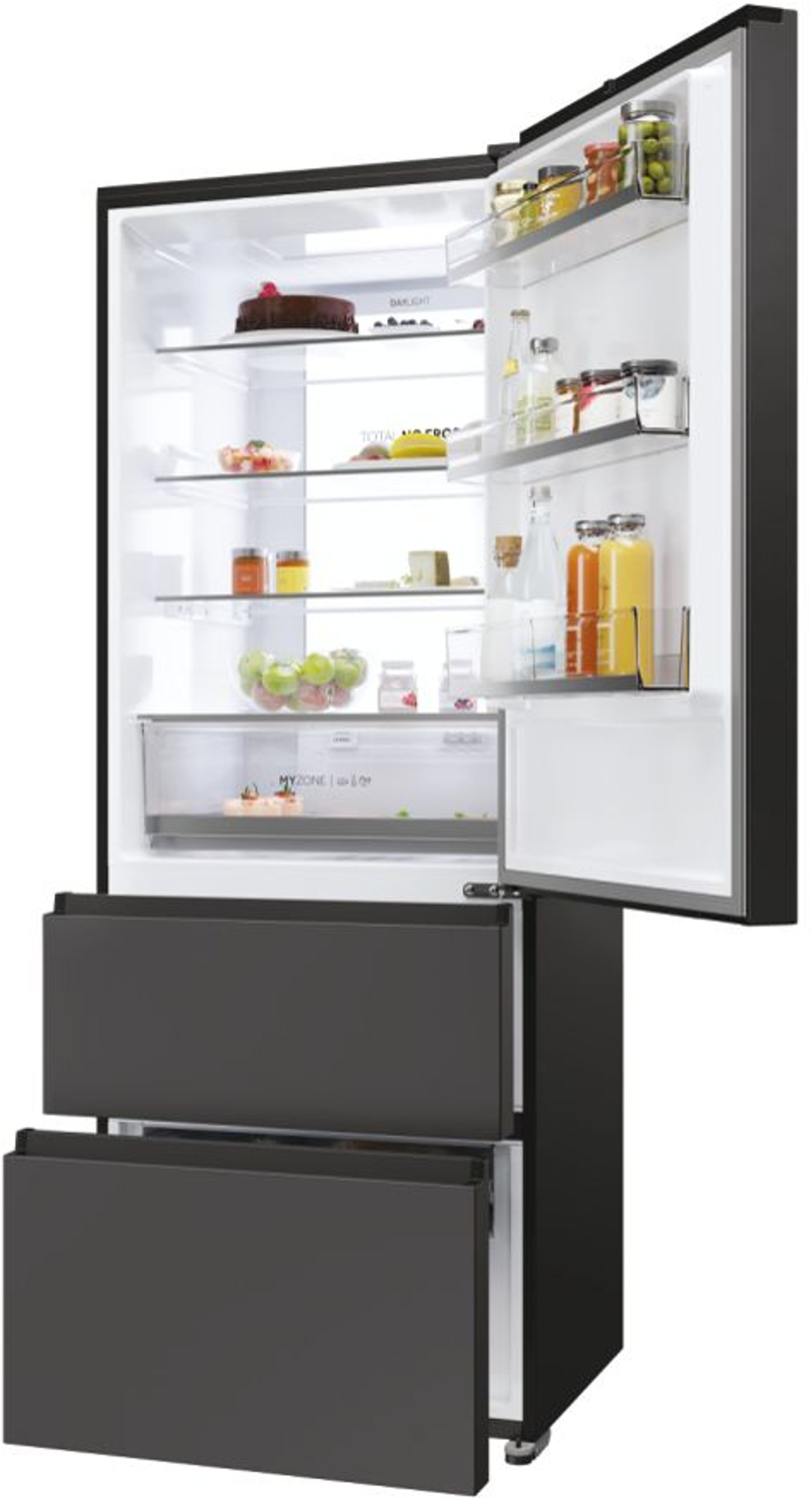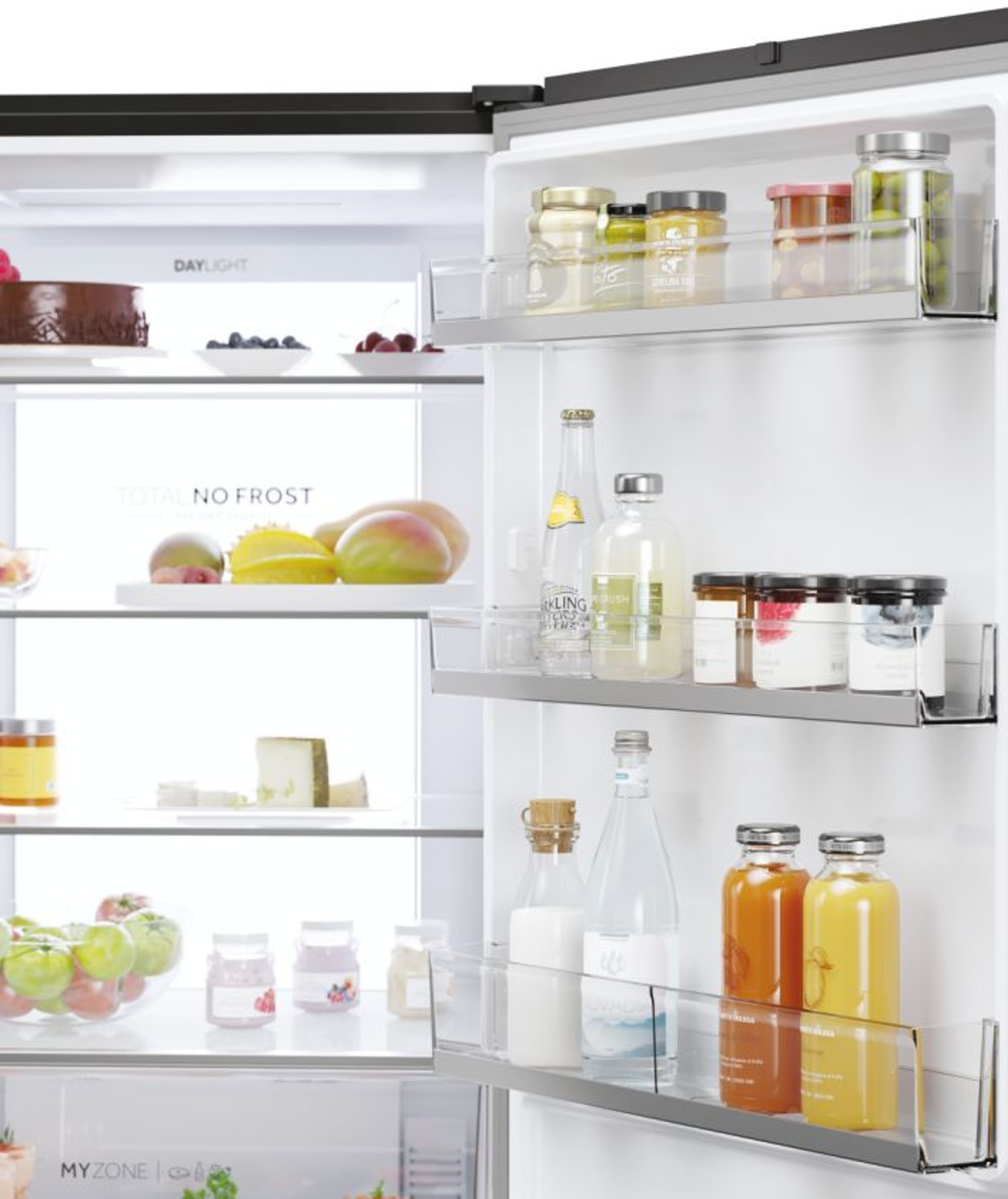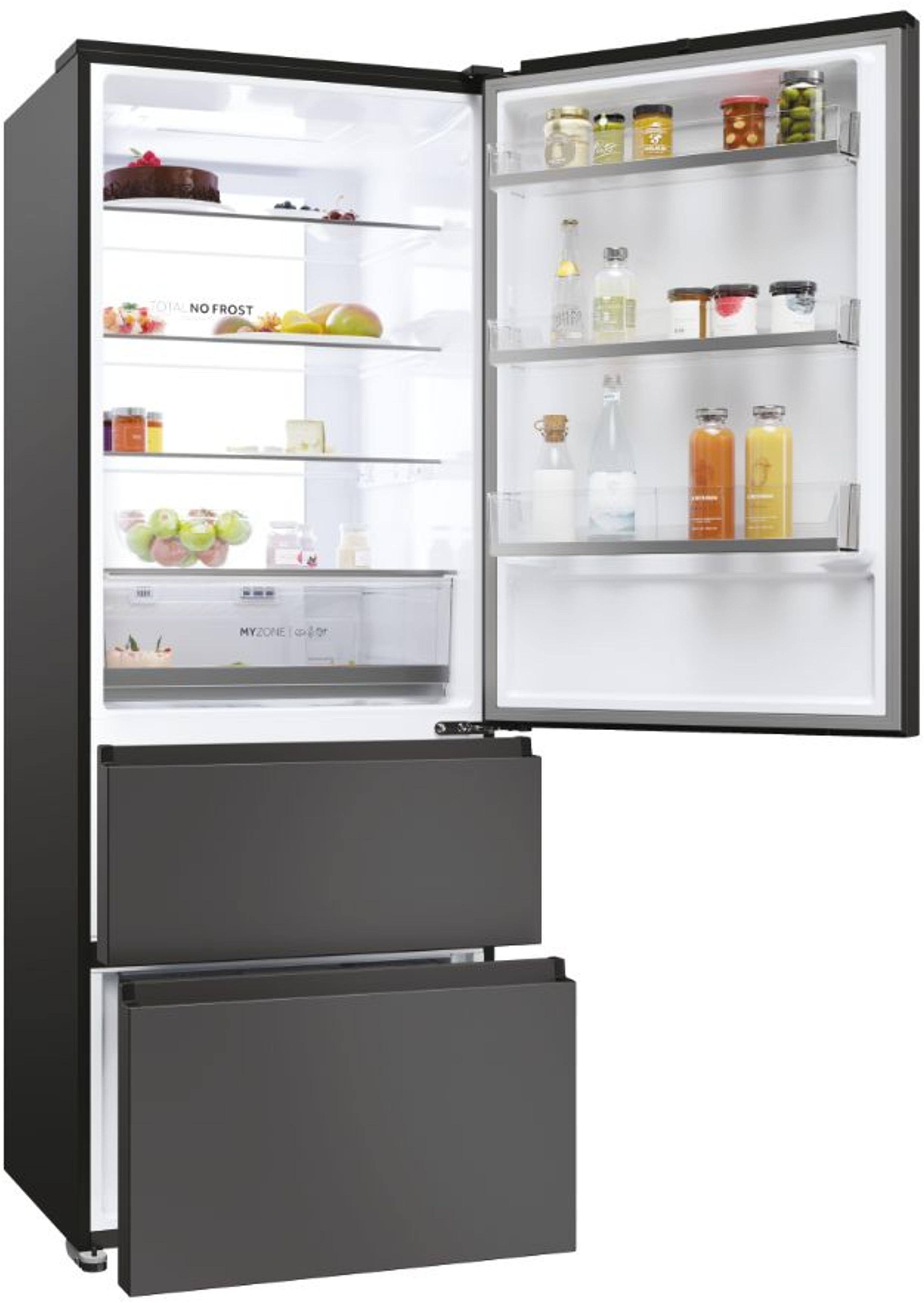 Haier HTR5719ENPT — це багатодверний холодильник преміум-класу з інверторним компресором Dual Inverter, який забезпечує тиху та енергоефективну роботу. Загальний об’єм 528 літрів дозволяє зберігати велику кількість продуктів, а технологія Total No Frost Fresher Techs® підтримує оптимальний рівень вологості та запобігає утворенню інею. Функції швидкого охолодження та заморожування, зона свіжості My Zone, а також LED-освітлення Day Light роблять користування зручним та ефективним. Електронне керування з дисплеєм на дверцятах дозволяє легко налаштовувати температуру, а акустичний сигнал попередить про відчинені двері. Стильний чорний дизайн з інтегрованими ручками гармонійно впишеться в сучасний інтер'єр кухні.