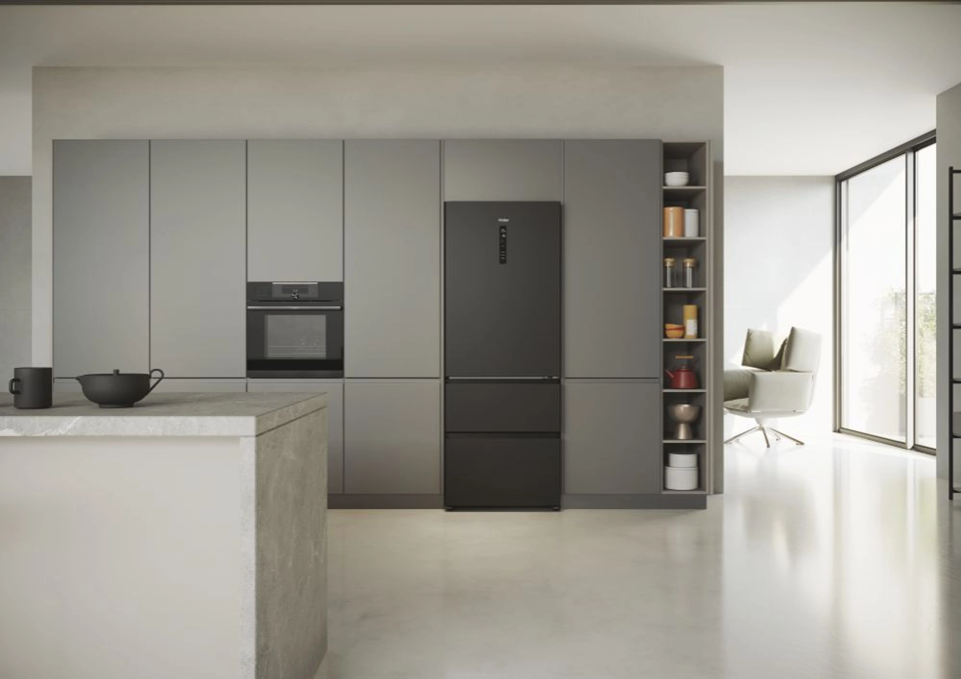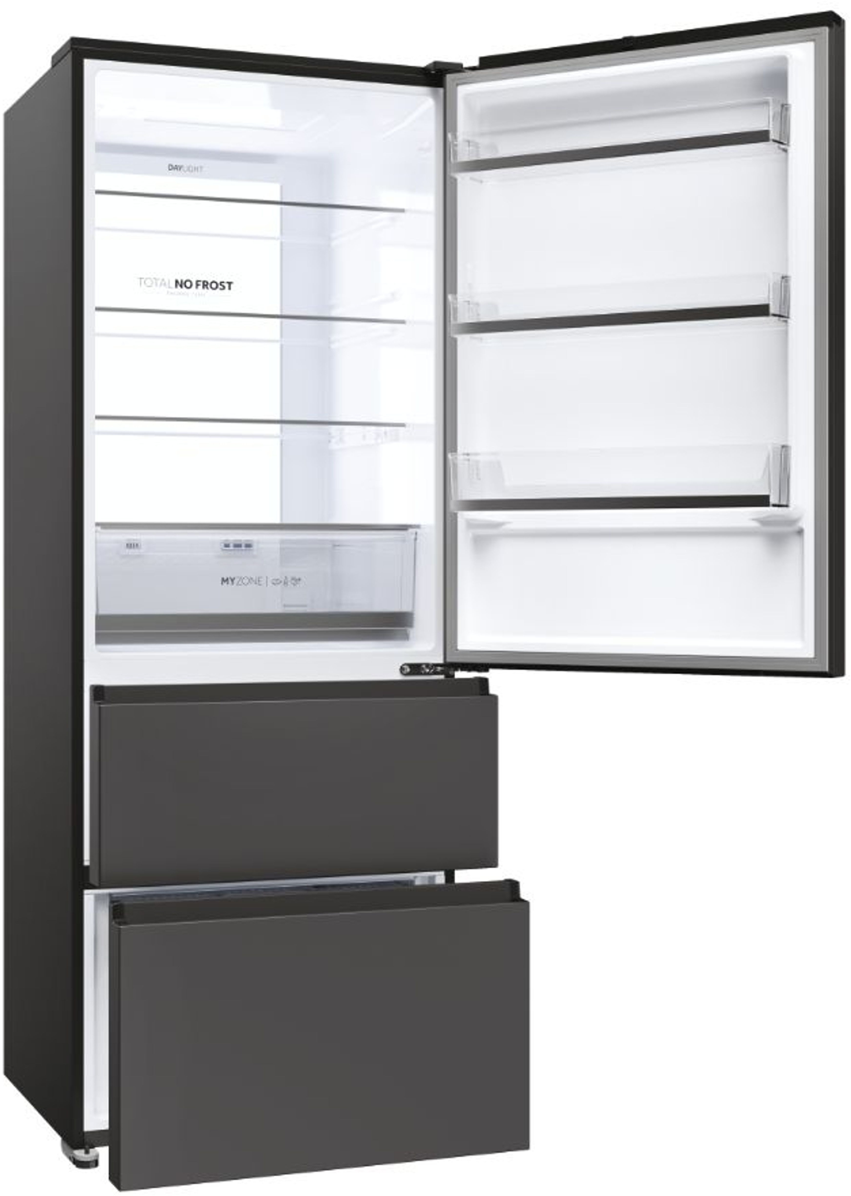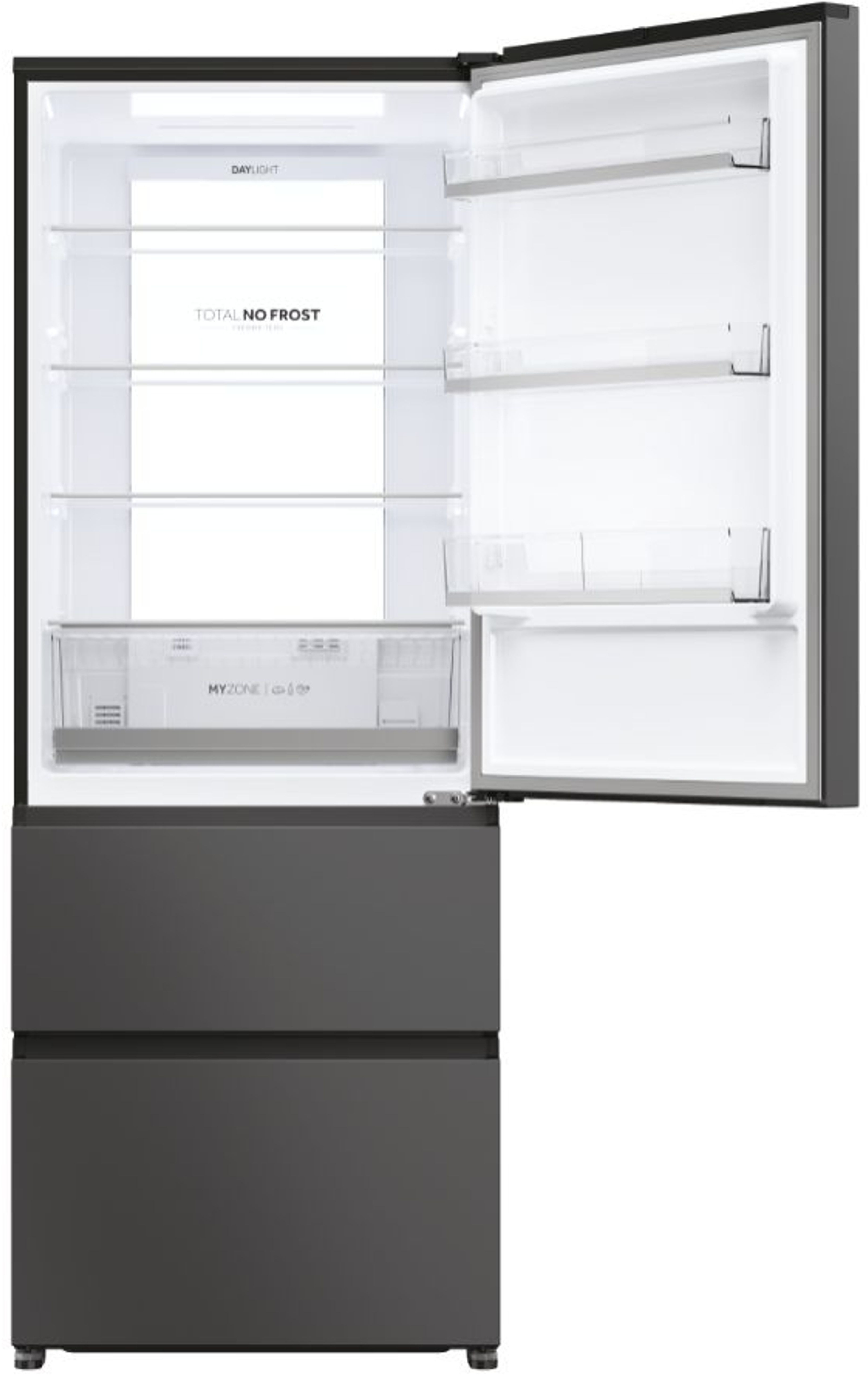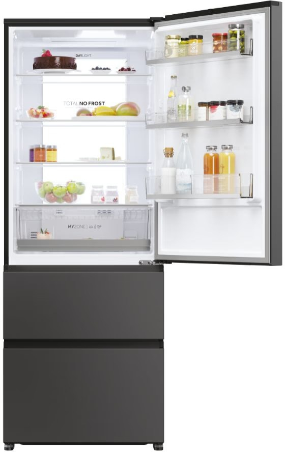 Haier HTR5719ENPT — це багатодверний холодильник преміум-класу з інверторним компресором Dual Inverter, який забезпечує тиху та енергоефективну роботу. Загальний об’єм 528 літрів дозволяє зберігати велику кількість продуктів, а технологія Total No Frost Fresher Techs® підтримує оптимальний рівень вологості та запобігає утворенню інею. Функції швидкого охолодження та заморожування, зона свіжості My Zone, а також LED-освітлення Day Light роблять користування зручним та ефективним. Електронне керування з дисплеєм на дверцятах дозволяє легко налаштовувати температуру, а акустичний сигнал попередить про відчинені двері. Стильний чорний дизайн з інтегрованими ручками гармонійно впишеться в сучасний інтер'єр кухні.
