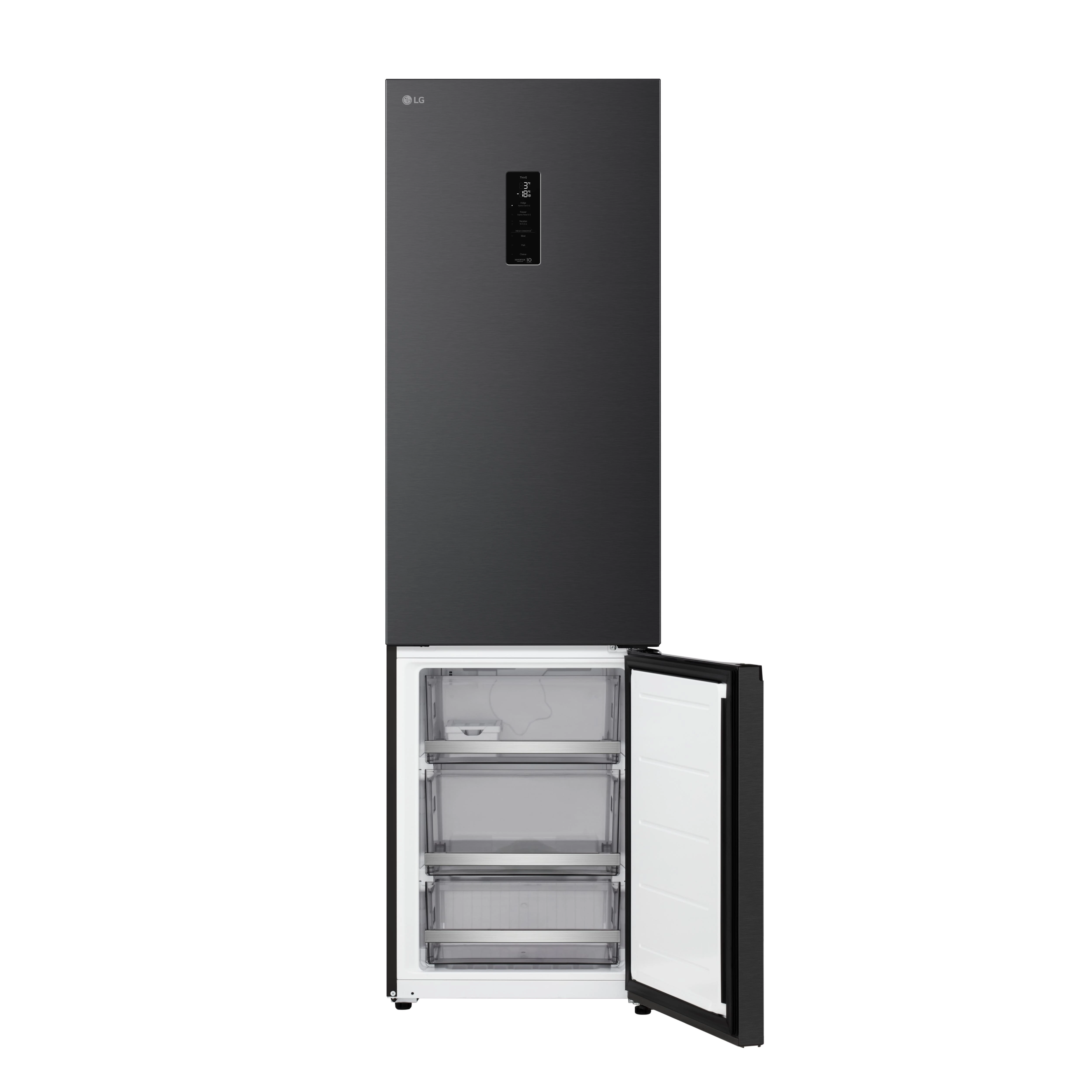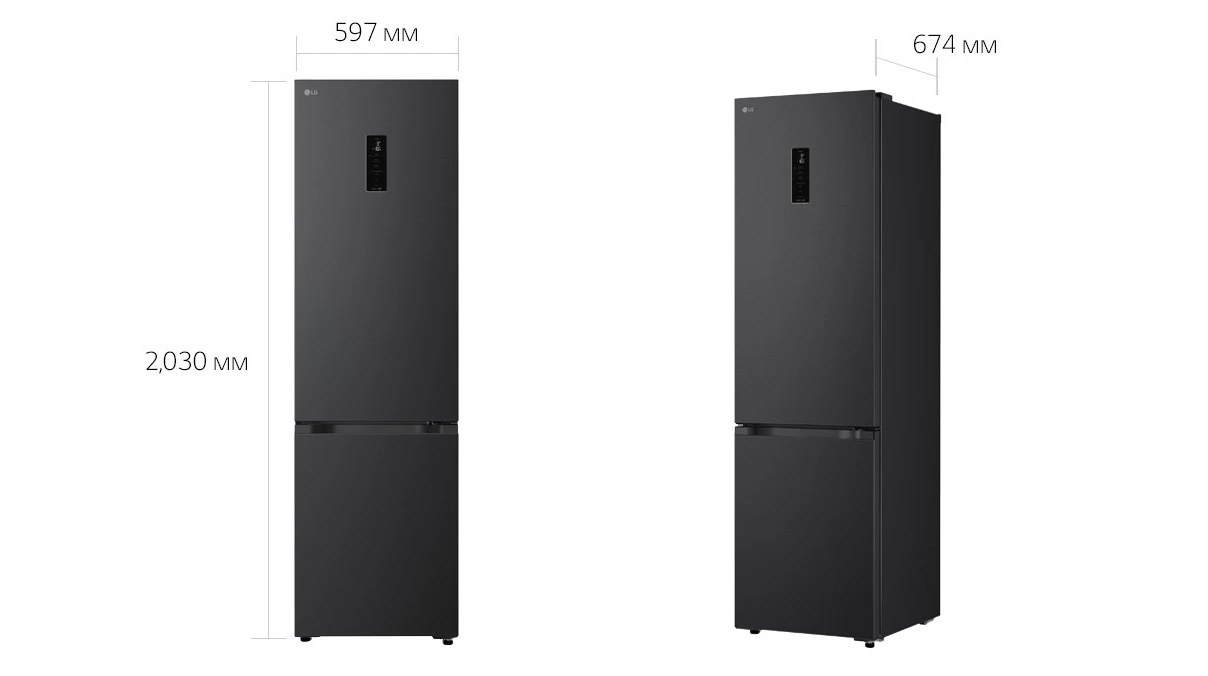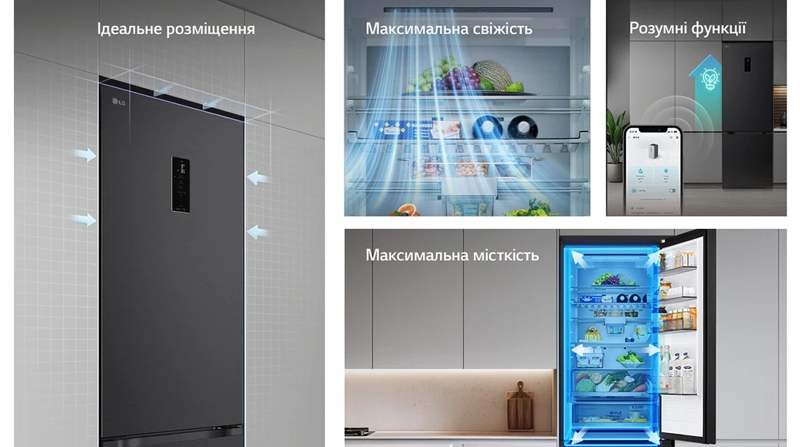 Холодильник LG GC-B509ETKM з нижньою морозильною камерою має загальний корисний об'єм 375 л (262 л холодильне відділення + 113 л морозильне). Пристрій оснащений інверторним компресором, системою Total No Frost, технологією DoorCooling+ та зовнішнім LED-дисплеєм. Зони Fresh Balancer і Fresh Converter дозволяють точно регулювати вологість і температуру для різних продуктів. Річне споживання енергії становить 263 кВт·год (клас E), рівень шуму - 35 дБ. Гарантія - 1 рік повна + 10 років на компресор.
