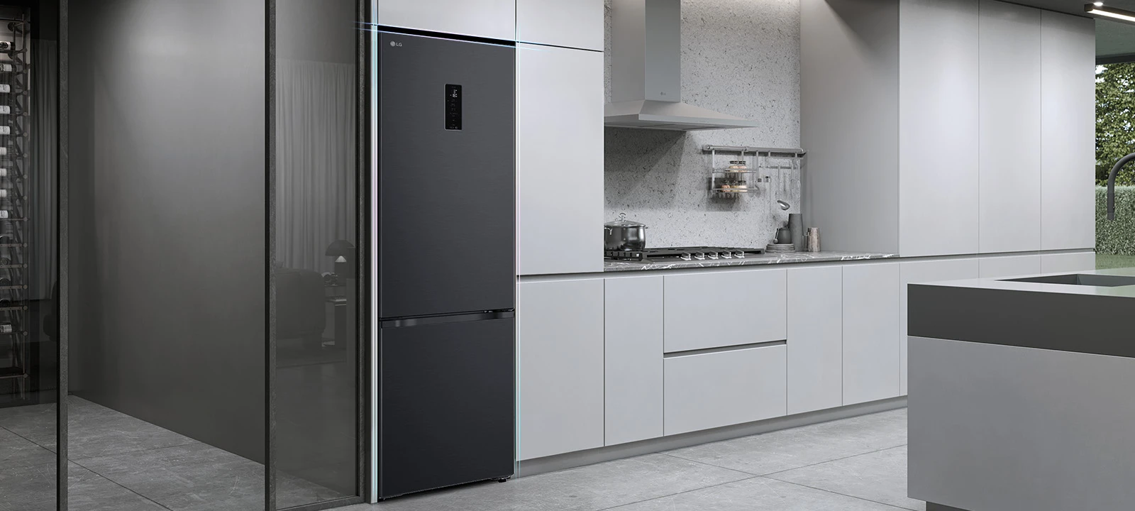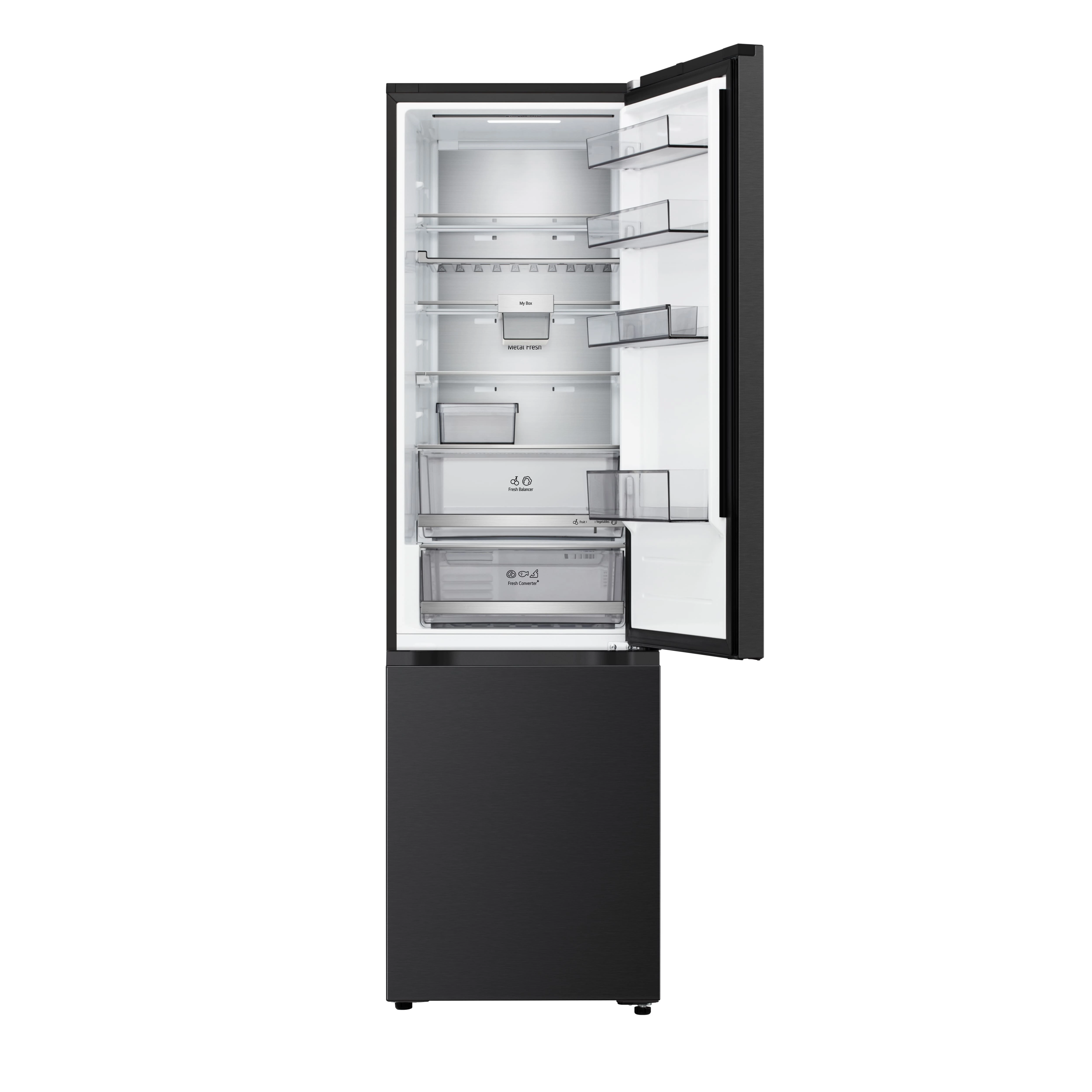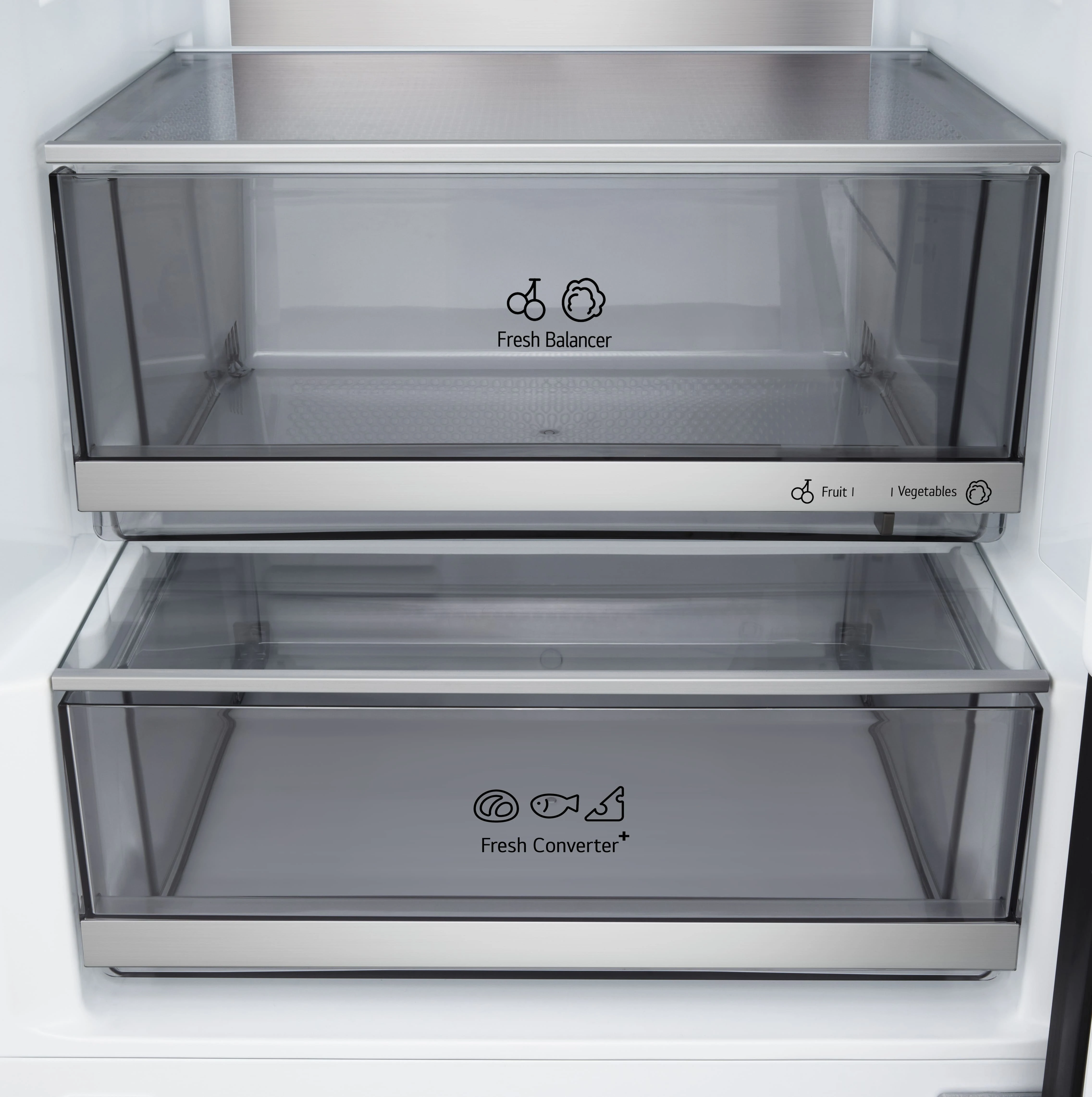 Холодильник LG GC-B509ETKM з нижньою морозильною камерою має загальний корисний об'єм 375 л (262 л холодильне відділення + 113 л морозильне). Пристрій оснащений інверторним компресором, системою Total No Frost, технологією DoorCooling+ та зовнішнім LED-дисплеєм. Зони Fresh Balancer і Fresh Converter дозволяють точно регулювати вологість і температуру для різних продуктів. Річне споживання енергії становить 263 кВт·год (клас E), рівень шуму - 35 дБ. Гарантія - 1 рік повна + 10 років на компресор.