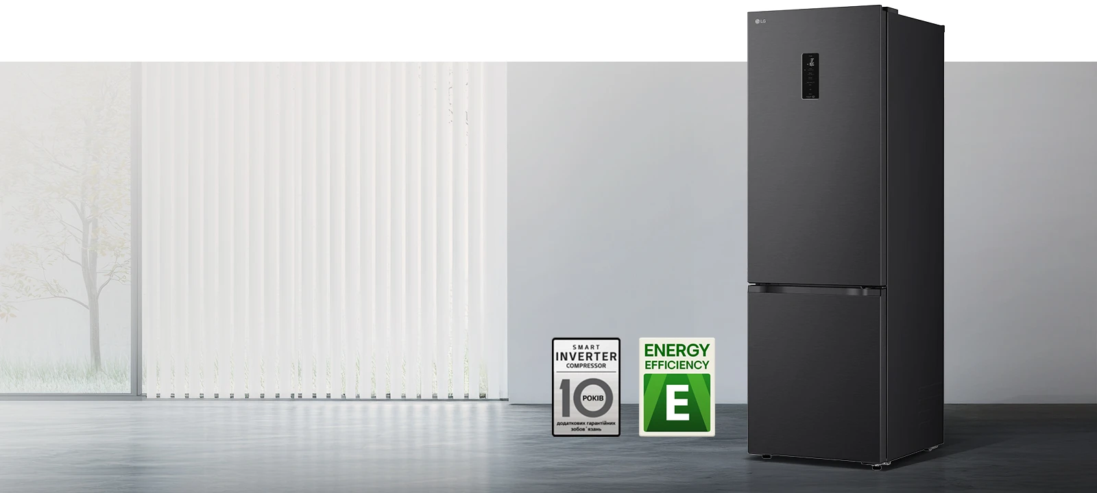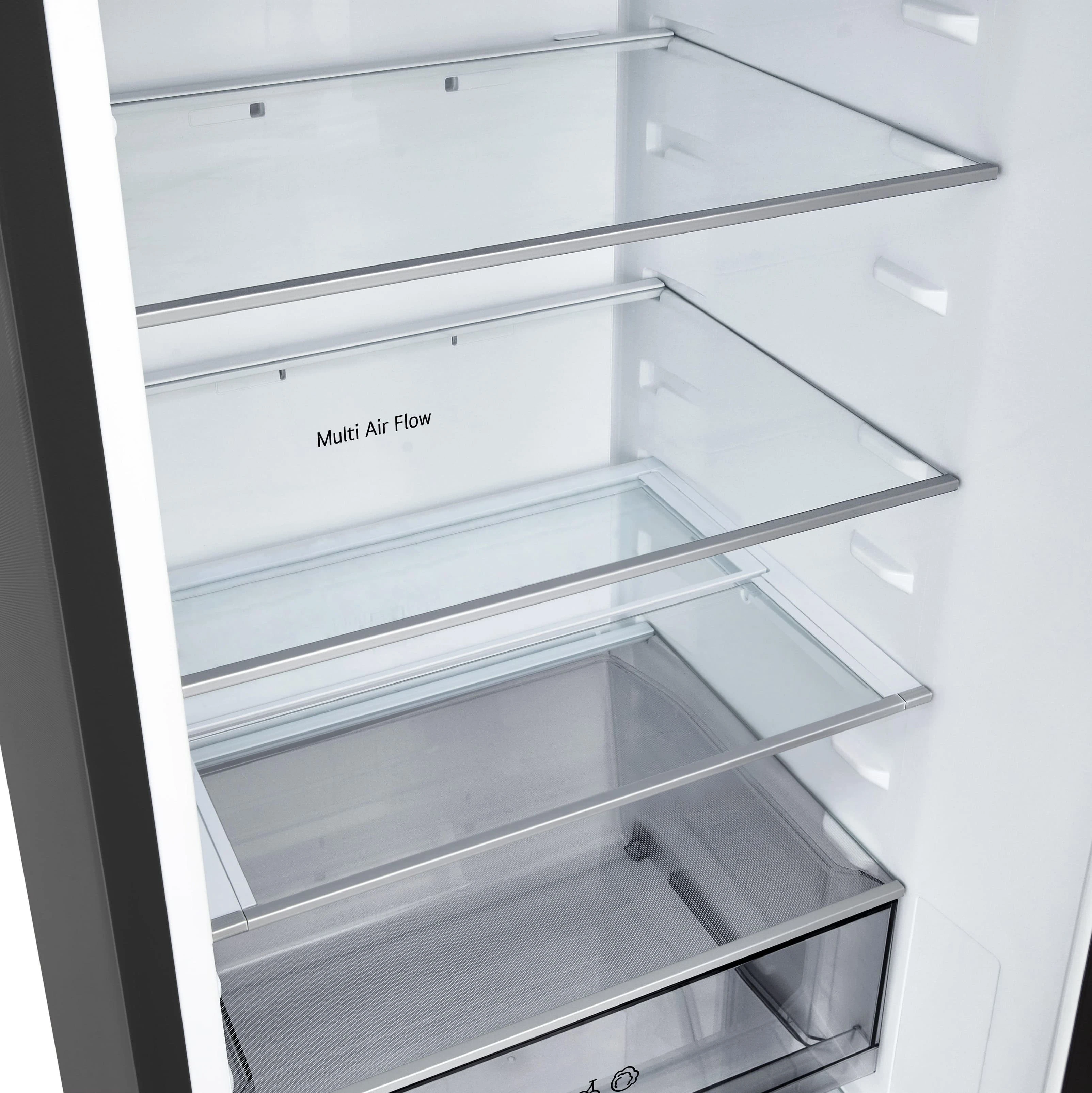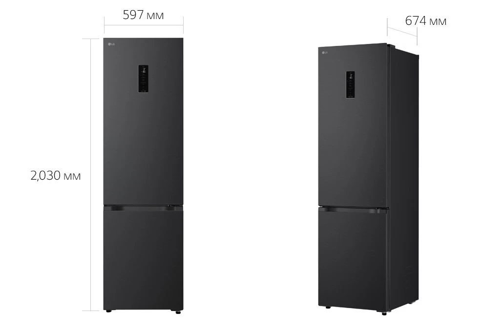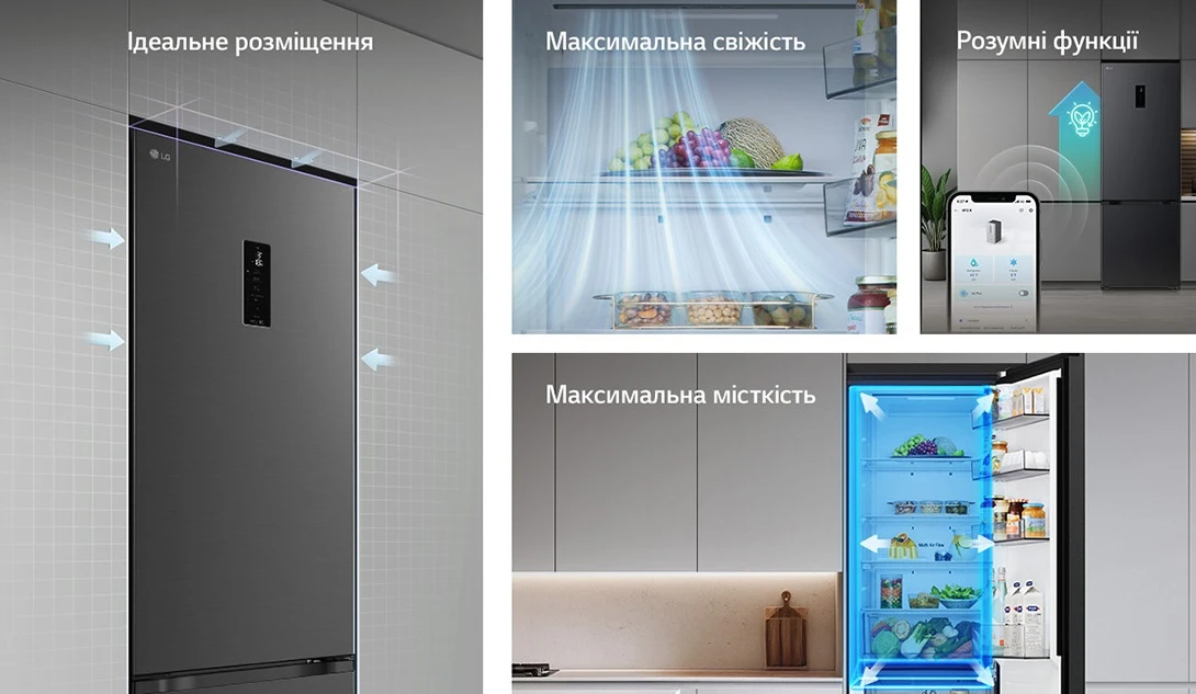 Холодильник LG GC-B509ETLM з нижньою морозильною камерою має загальний корисний об'єм 375 л (262 л холодильне відділення + 113 л морозильне). Пристрій оснащений інверторним компресором, системою Total No Frost, технологією DoorCooling+ та зовнішнім LED-дисплеєм. Зона свіжості Fresh Zone підтримує оптимальні умови для тривалого зберігання продуктів. Річне споживання енергії становить 263 кВт·год (клас E), рівень шуму - 35 дБ. Гарантія - 1 рік повна + 10 років на компресор.