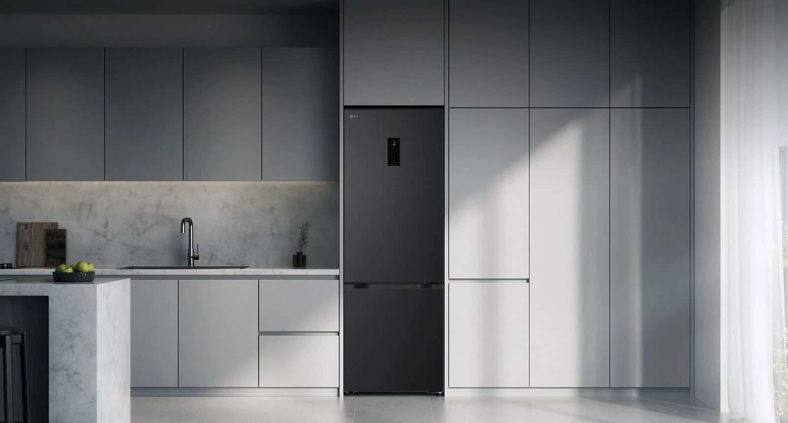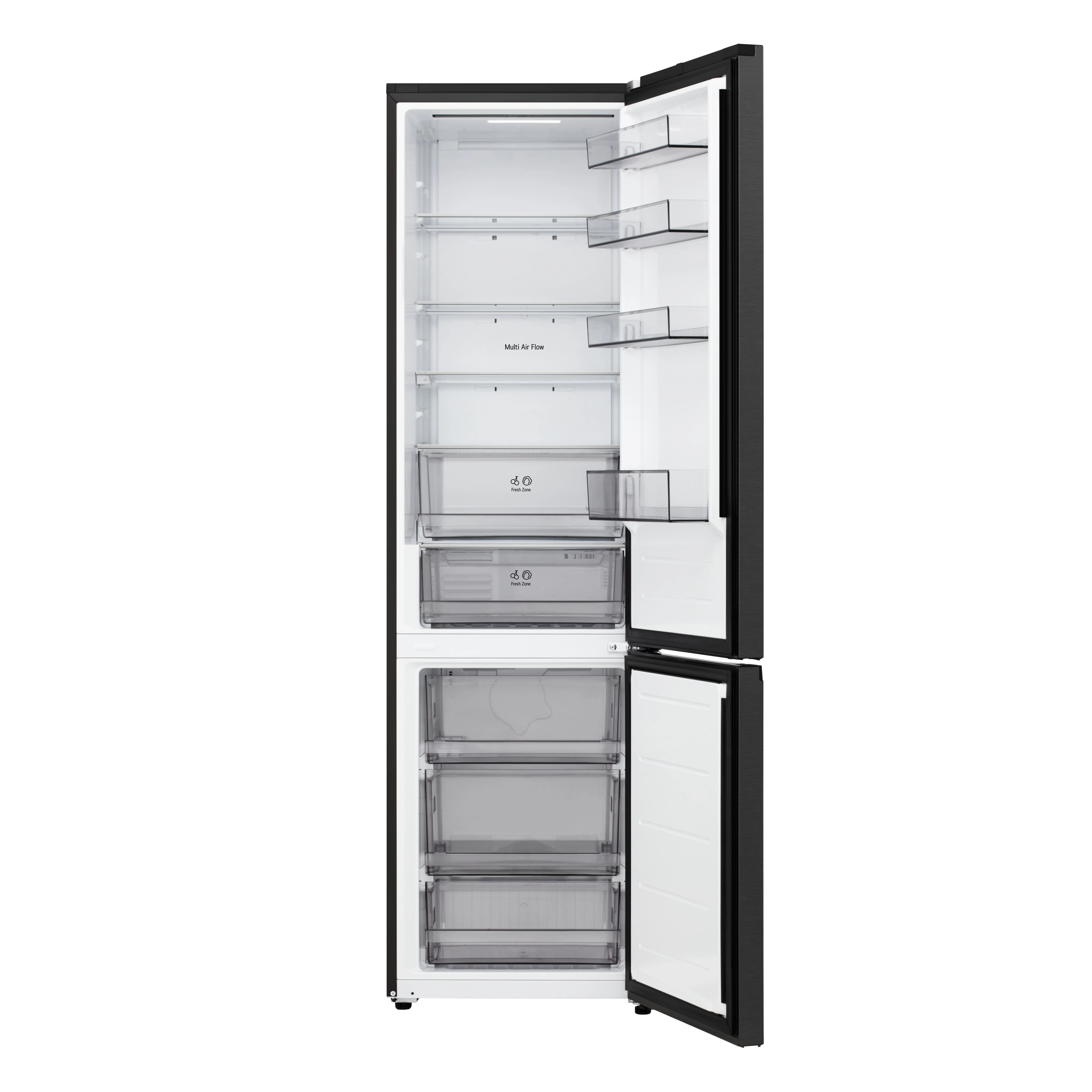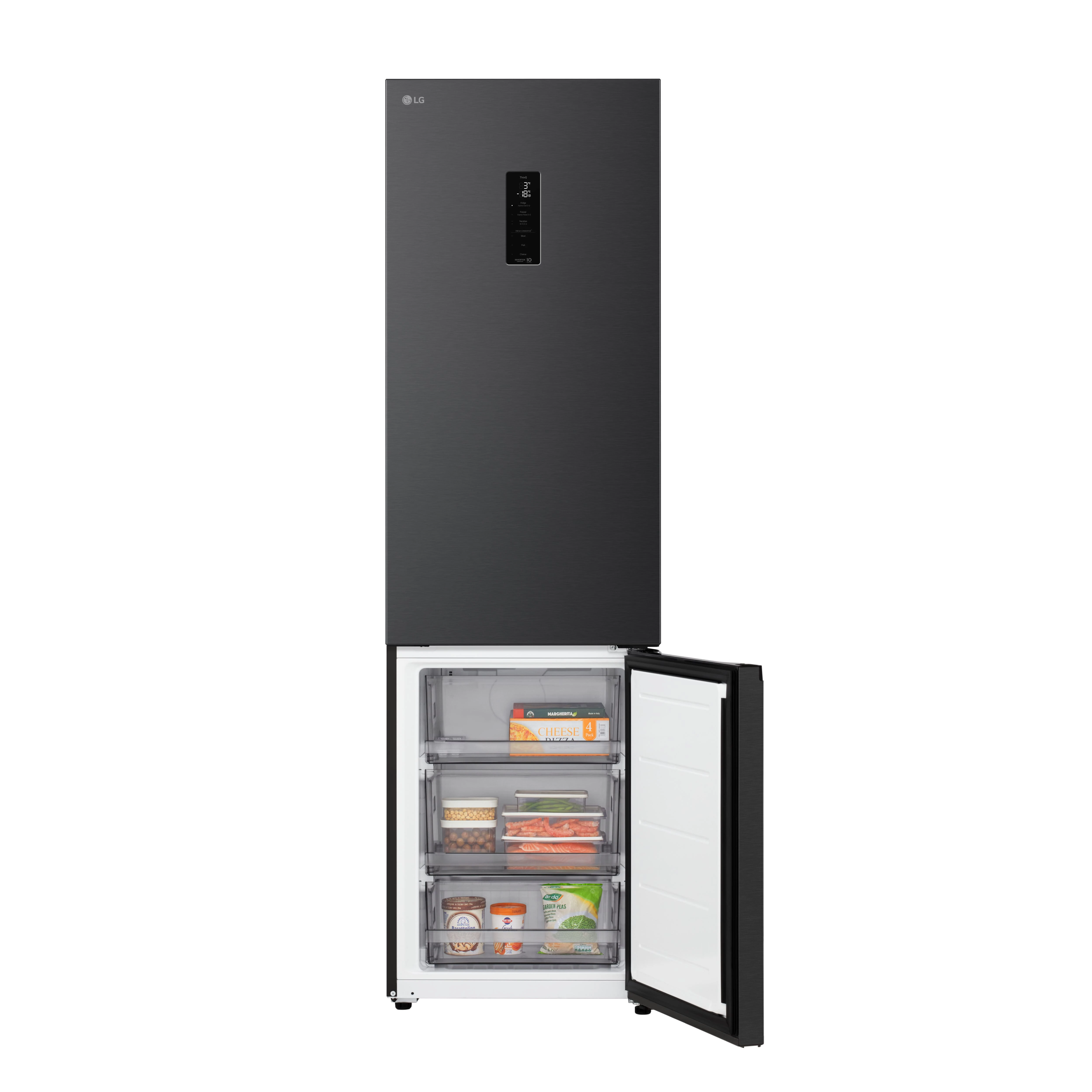 Холодильник LG GC-B509ETLM з нижньою морозильною камерою має загальний корисний об'єм 375 л (262 л холодильне відділення + 113 л морозильне). Пристрій оснащений інверторним компресором, системою Total No Frost, технологією DoorCooling+ та зовнішнім LED-дисплеєм. Зона свіжості Fresh Zone підтримує оптимальні умови для тривалого зберігання продуктів. Річне споживання енергії становить 263 кВт·год (клас E), рівень шуму - 35 дБ. Гарантія - 1 рік повна + 10 років на компресор.