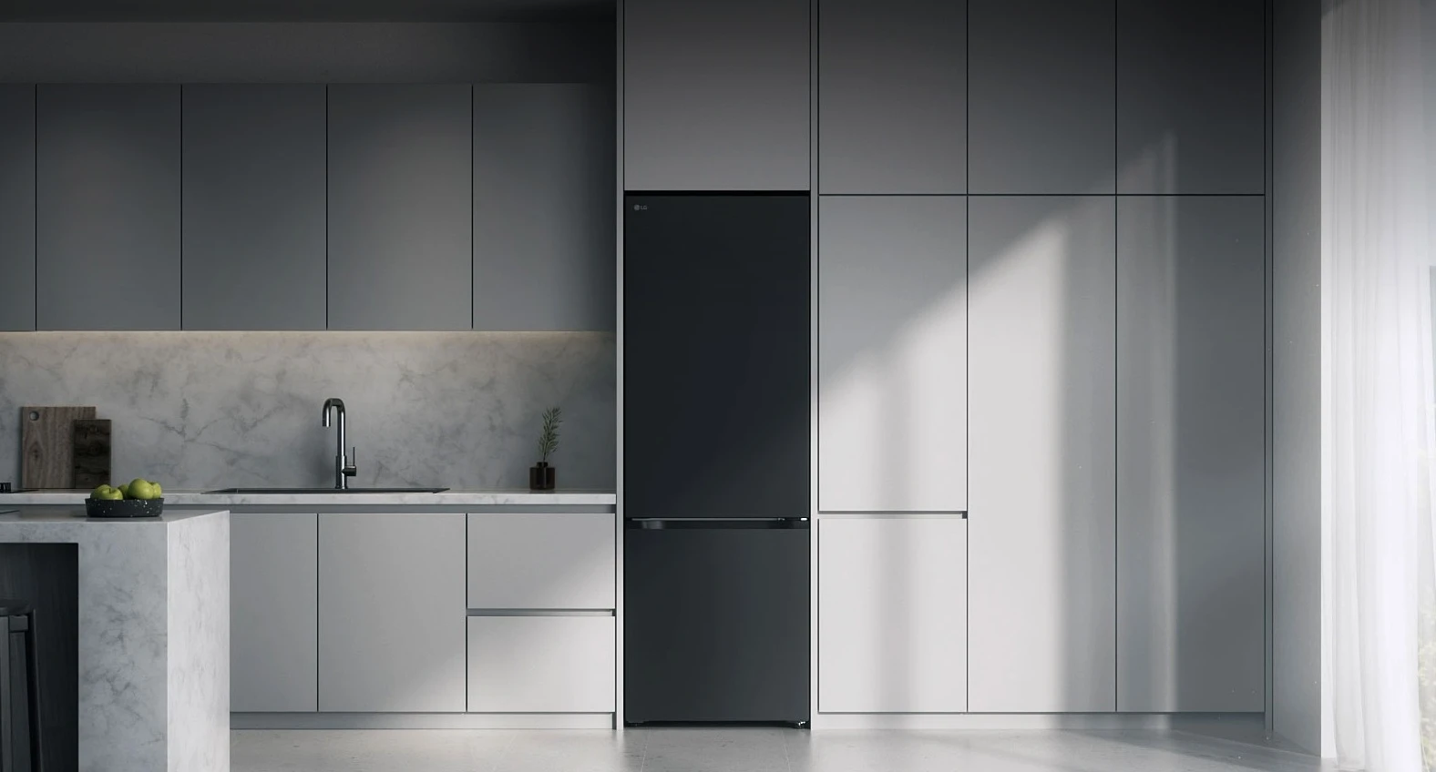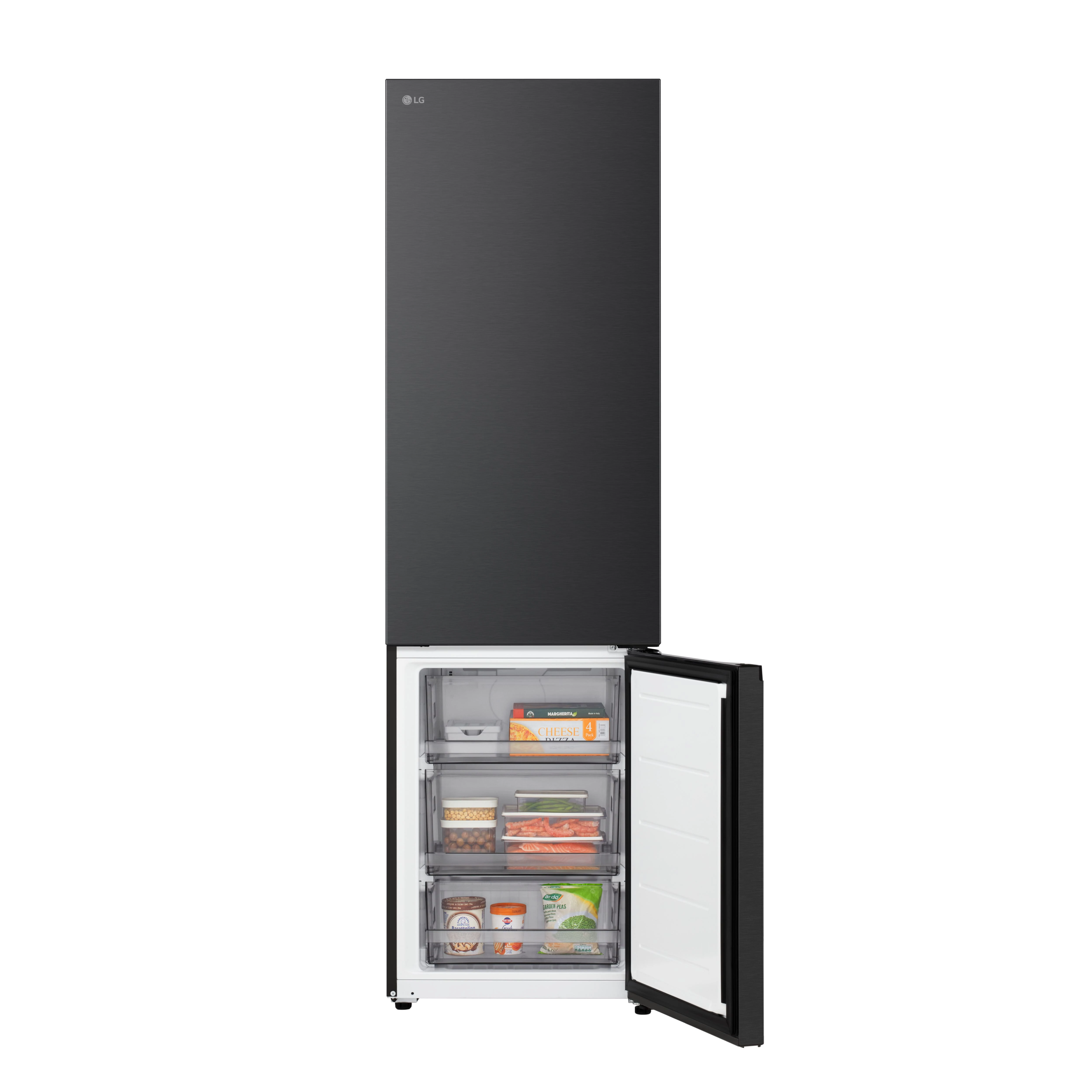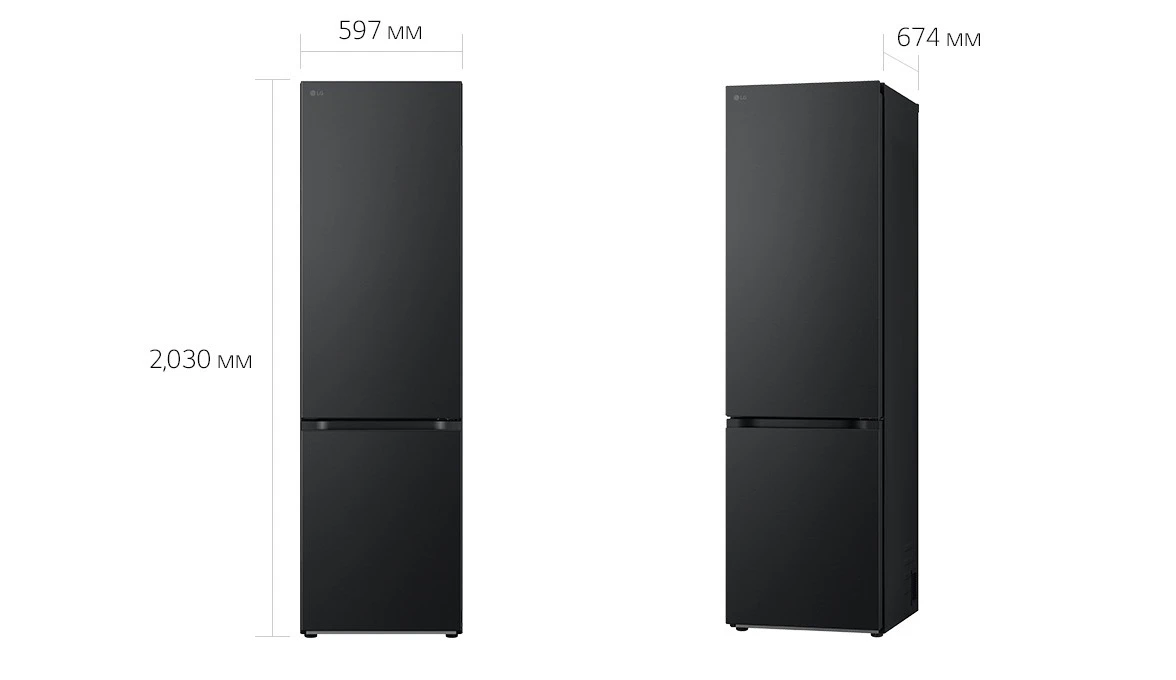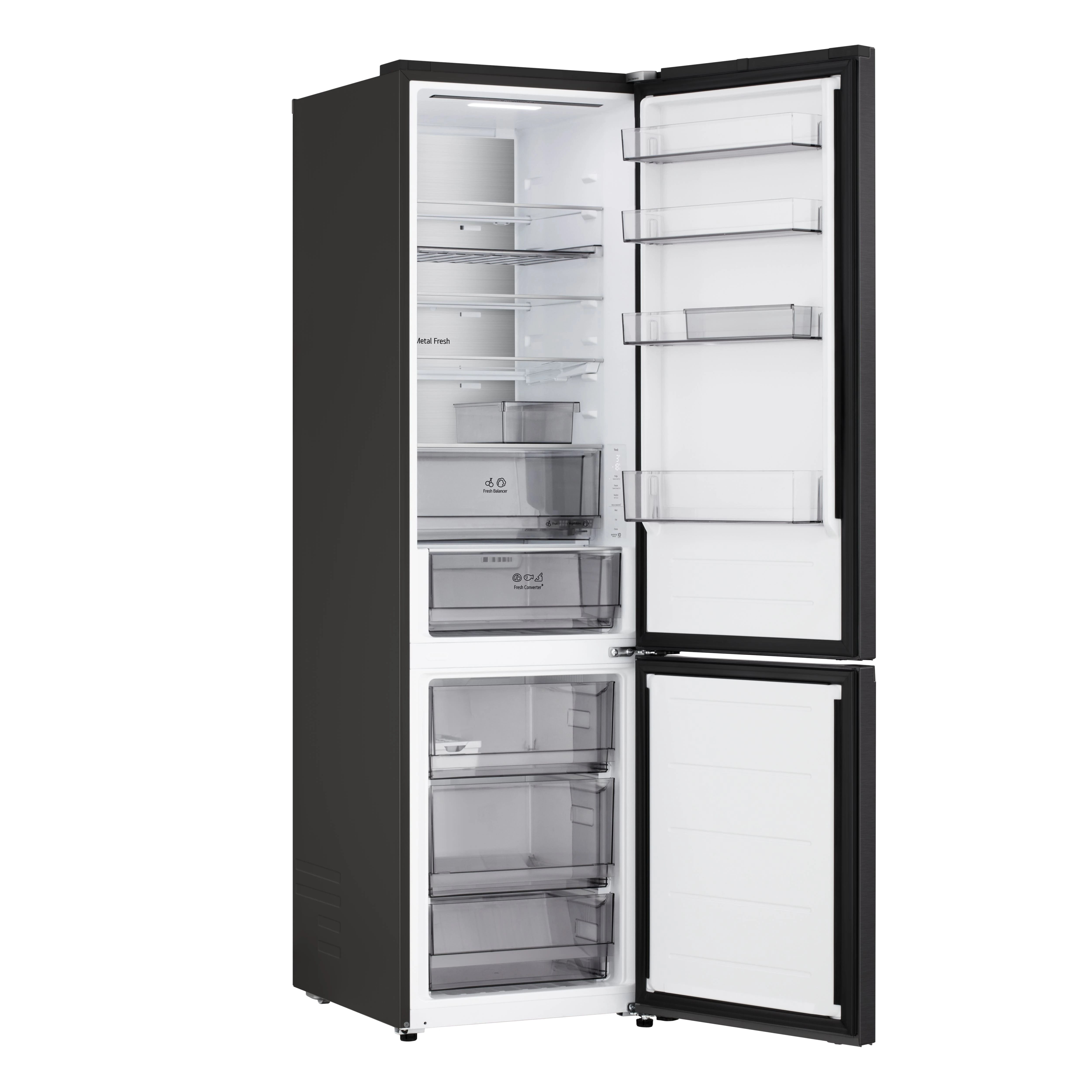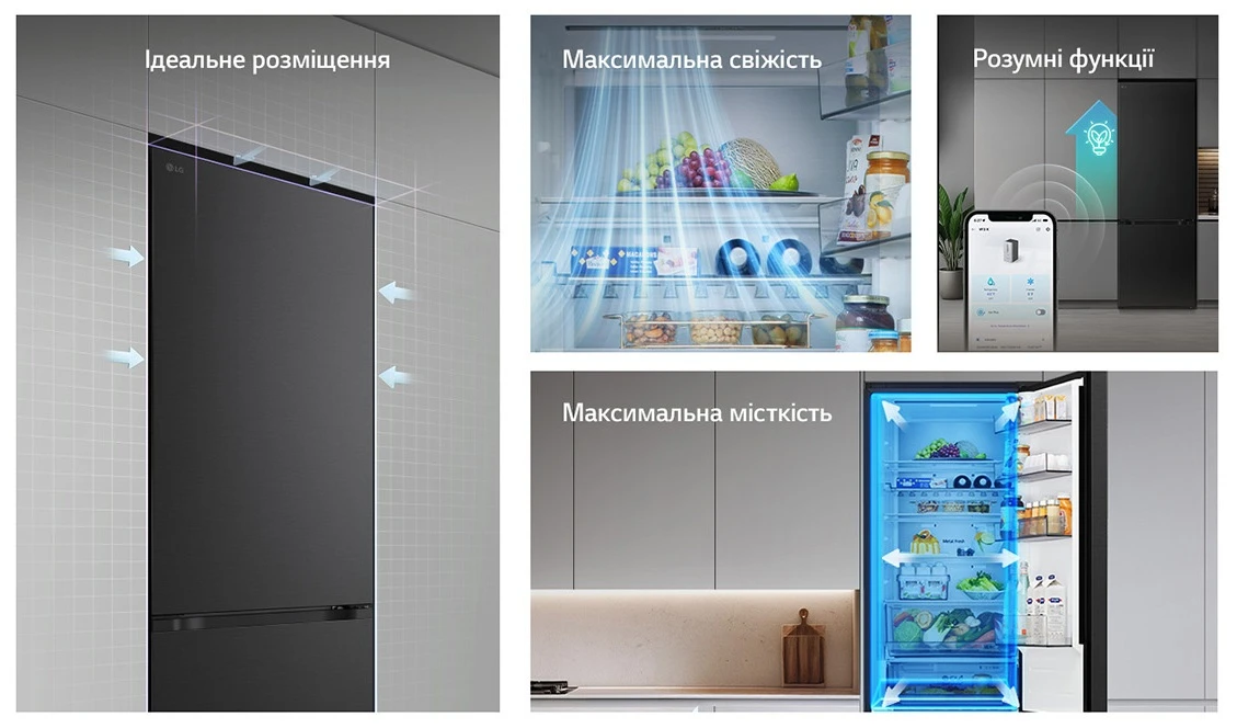 Холодильник LG GC-B509ETSM з нижньою морозильною камерою має корисний об’єм 375 л (262 л холодильне + 113 л морозильне відділення) і належить до енергетичного класу E. Інверторний компресор забезпечує рівень шуму 35 дБ та потужність заморожування 10 кг на добу. Система Total No Frost усуває необхідність розморожування, а Metal Fresh разом із зонами Fresh Converter та Fresh Balancer підтримують оптимальні умови для різних продуктів. Матове чорне покриття корпусу та прихована горизонтальна ручка створюють стриманий сучасний вигляд.