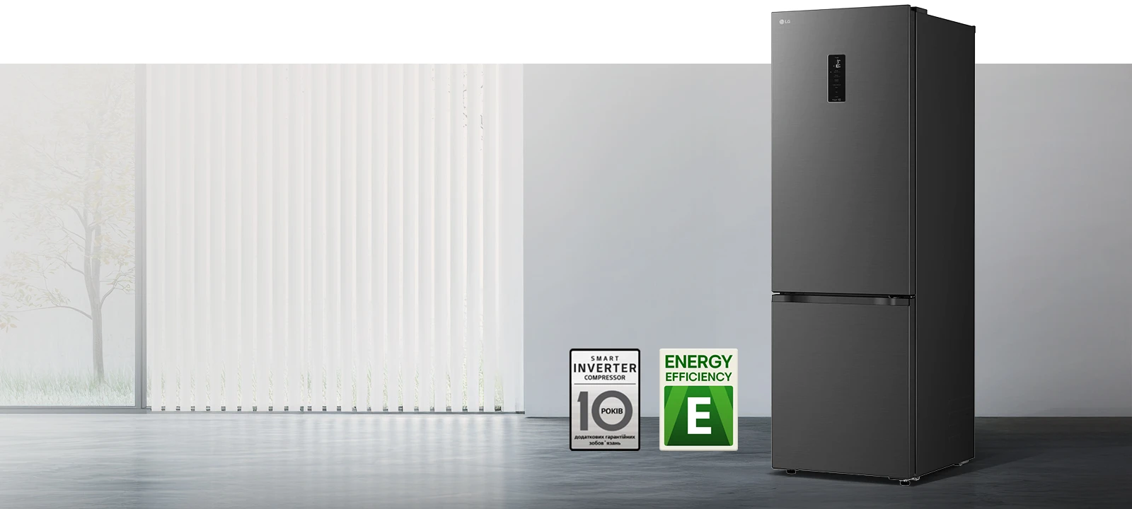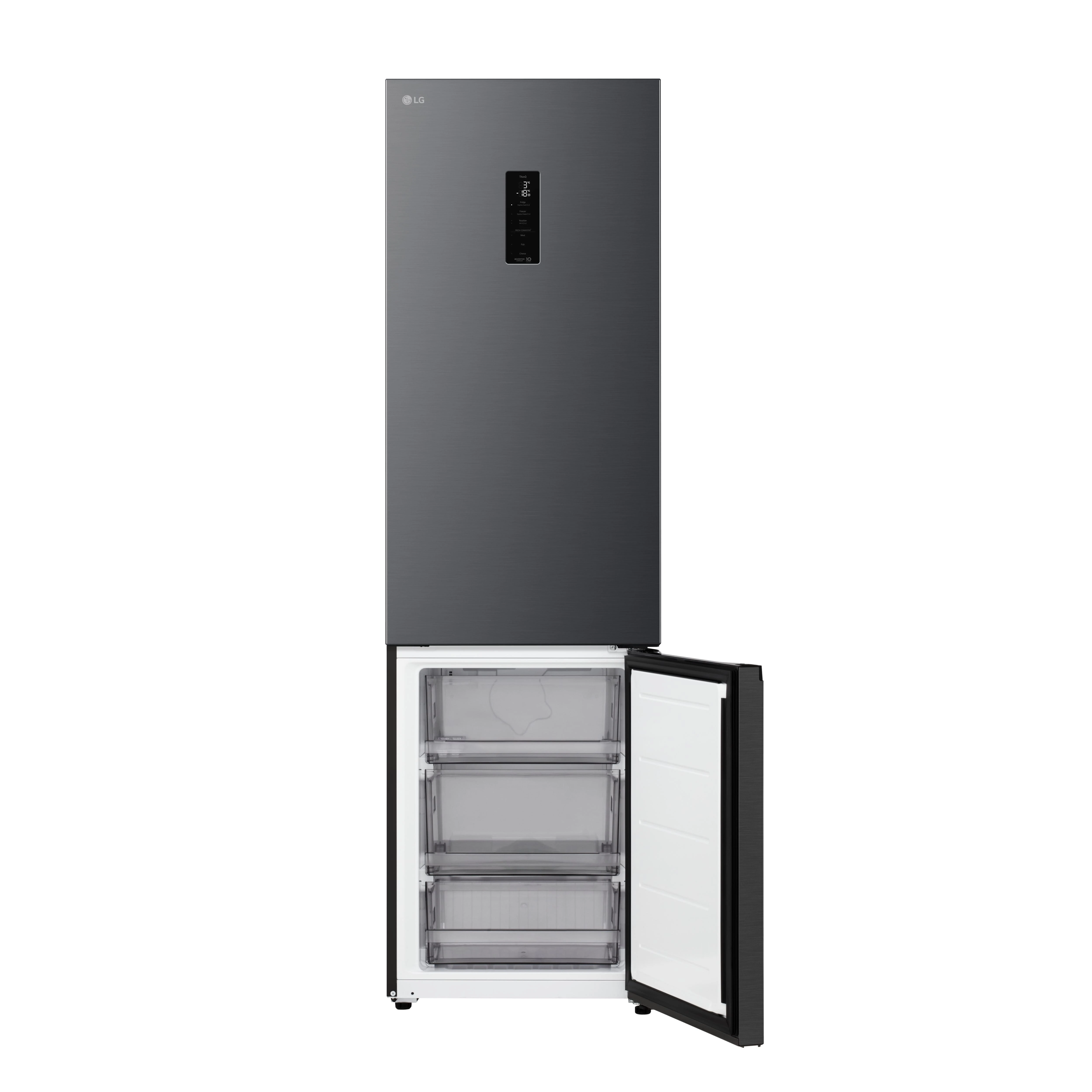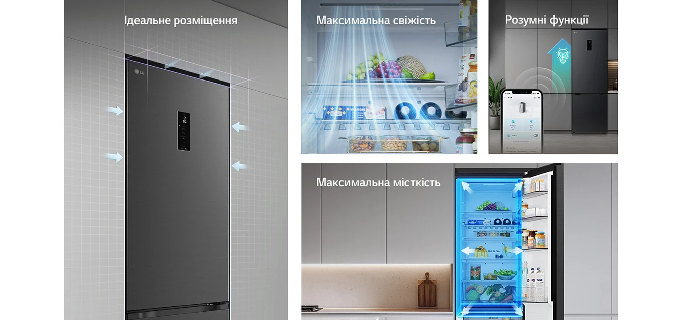 Холодильник LG GC-B509ETTM з нижньою морозильною камерою має загальний корисний об'єм 375 л (262 л холодильне відділення + 113 л морозильне). Пристрій оснащений інверторним компресором, системою Total No Frost, технологією DoorCooling+ та зовнішнім LED-дисплеєм. Зони Fresh Balancer і Fresh Converter дозволяють точно регулювати вологість і температуру для різних продуктів. Річне споживання енергії становить 263 кВт·год (клас E), рівень шуму - 35 дБ. Гарантія - 1 рік повна + 10 років на компресор.