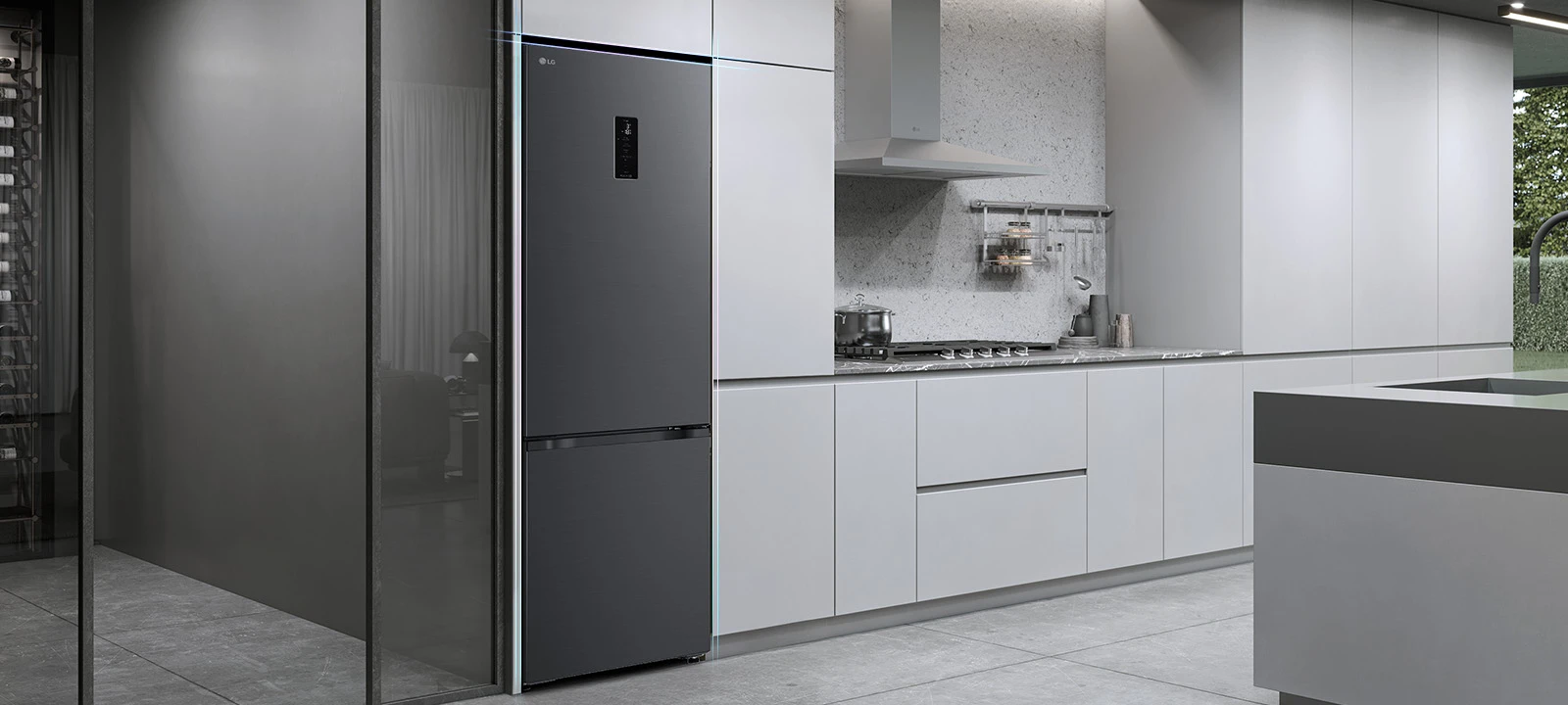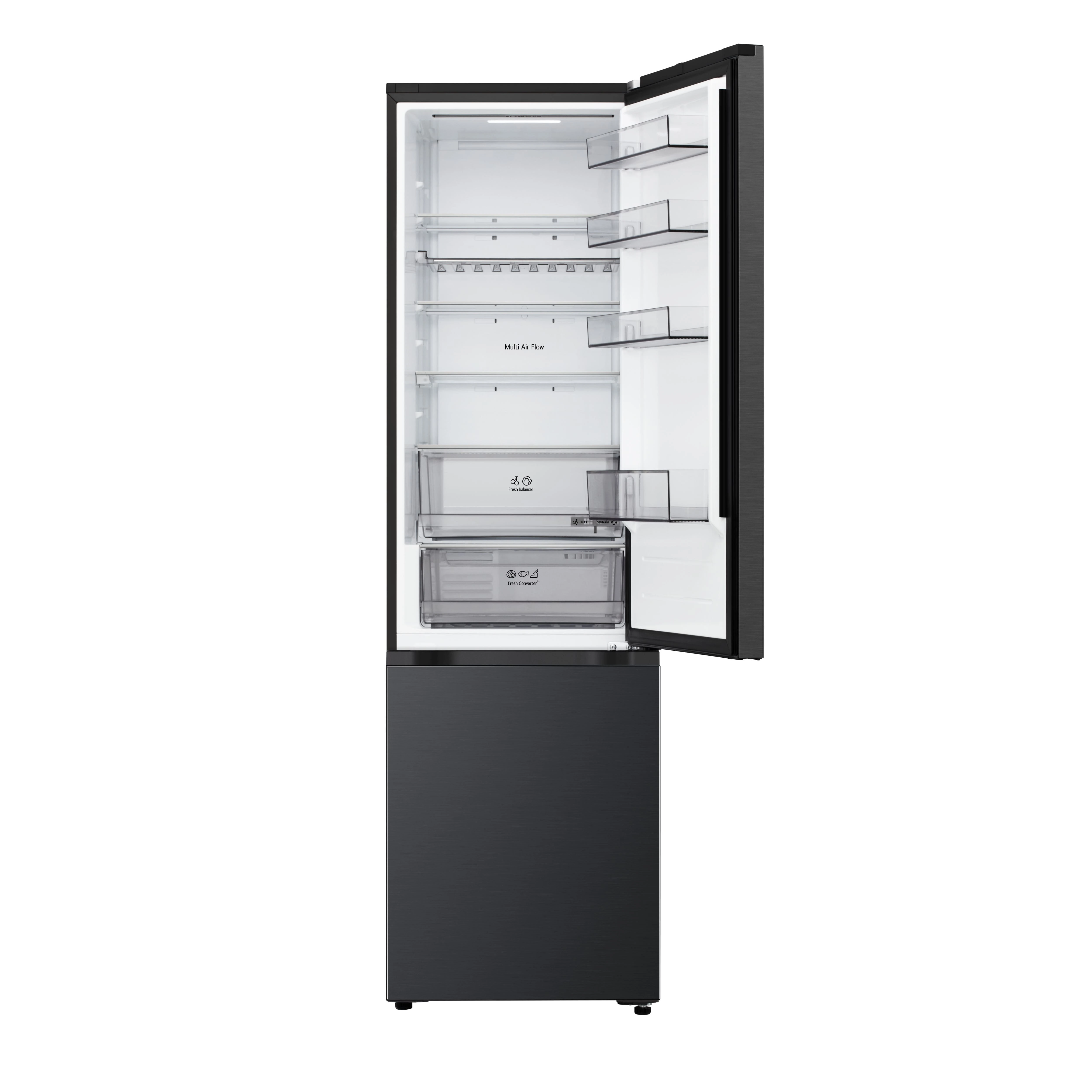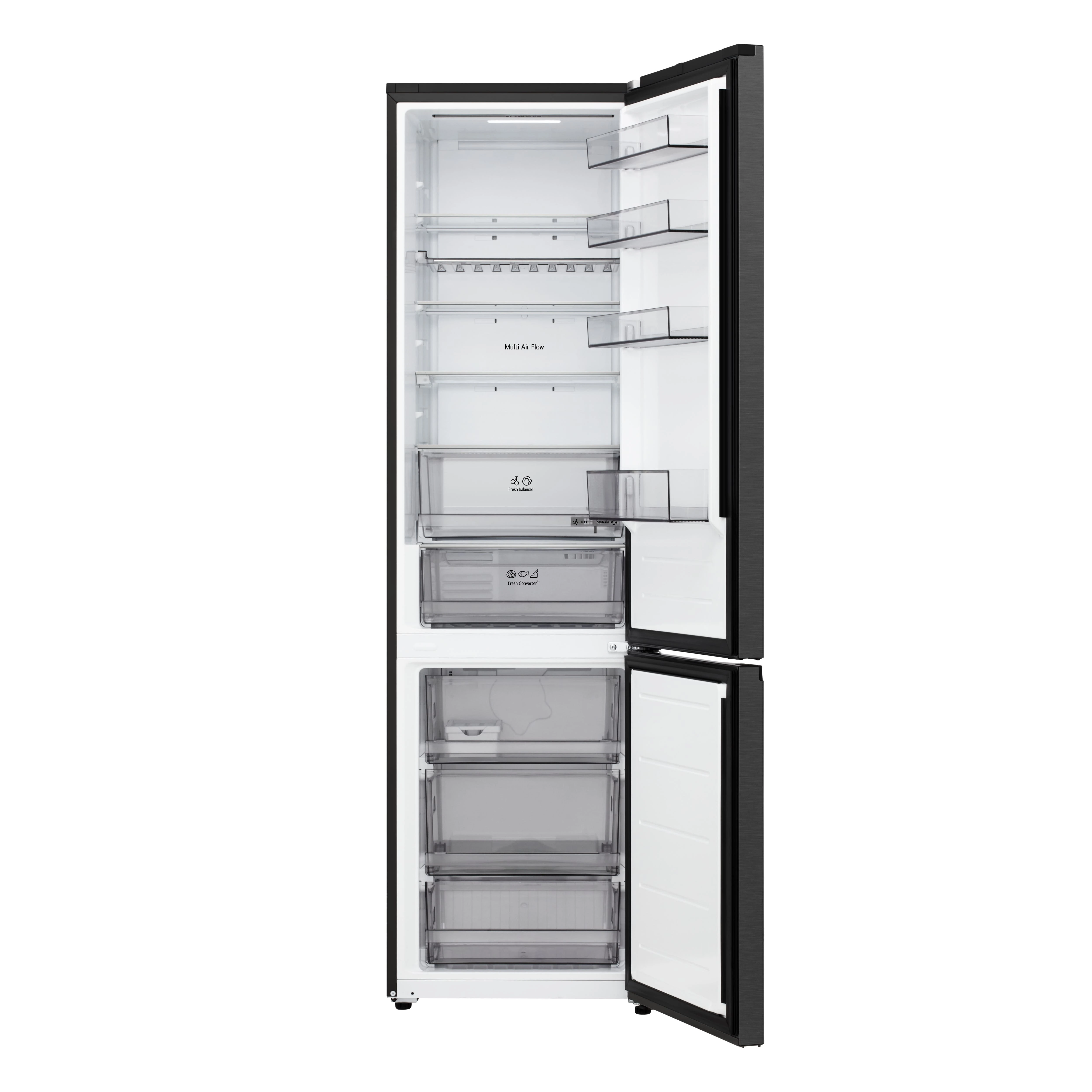 Холодильник LG GC-B509ETTM з нижньою морозильною камерою має загальний корисний об'єм 375 л (262 л холодильне відділення + 113 л морозильне). Пристрій оснащений інверторним компресором, системою Total No Frost, технологією DoorCooling+ та зовнішнім LED-дисплеєм. Зони Fresh Balancer і Fresh Converter дозволяють точно регулювати вологість і температуру для різних продуктів. Річне споживання енергії становить 263 кВт·год (клас E), рівень шуму - 35 дБ. Гарантія - 1 рік повна + 10 років на компресор.
