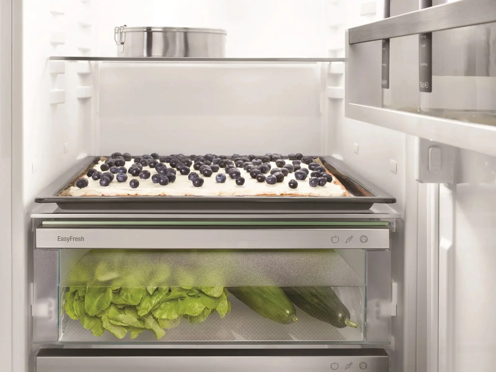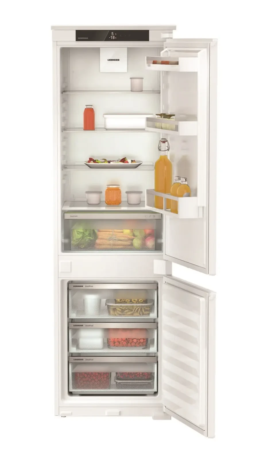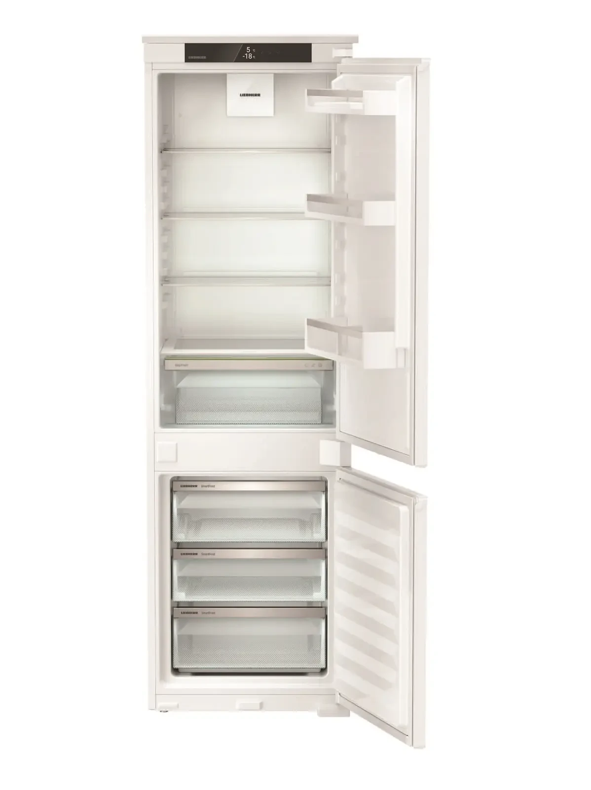 Вбудований холодильник Liebherr ICSE5103 з нижньою морозильною камерою забезпечує ефективне зберігання продуктів завдяки технологіям EasyFresh, DuoCooling, SuperCool та SmartFrost. Оснащений сенсорним дисплеєм, сучасною системою фільтрації повітря, світлодіодним освітленням і можливістю підключення до SmartDeviceBox.