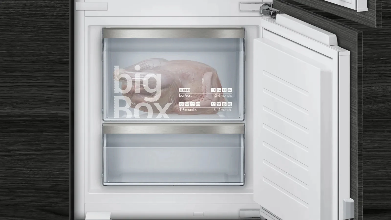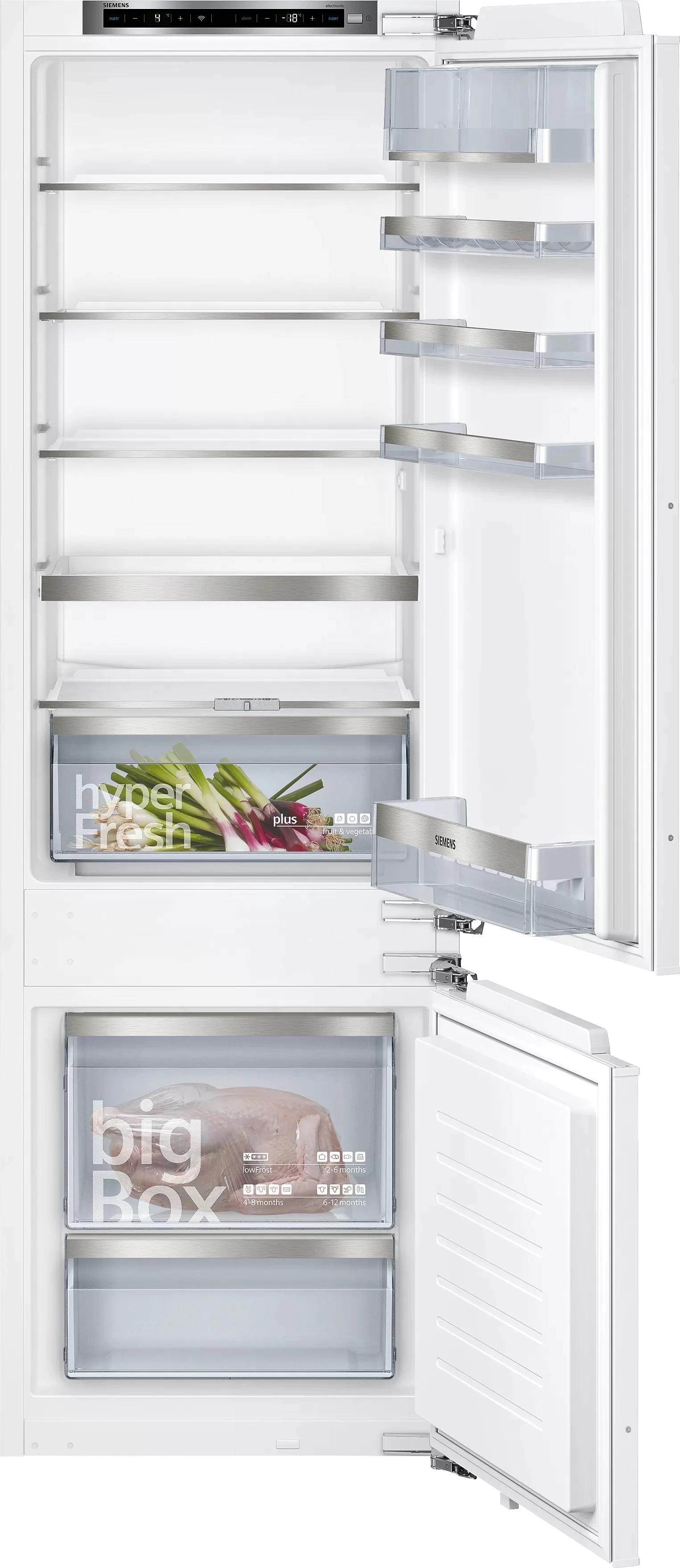 Вбудований холодильник Siemens iQ500 з нижньою морозильною камерою поєднує зону свіжості hyperFresh plus для овочів і фруктів, технологію lowFrost для рідшого та простішого розморожування, рівномірне LED-освітлення та місткий контейнер bigBox у морозильному відділенні. Рухома скляна полиця полегшує доступ до продуктів і дає змогу швидко оцінити вміст холодильника. Гнучка організація полиць і контейнерів допомагає раціонально використати простір і підтримувати порядок усередині.
