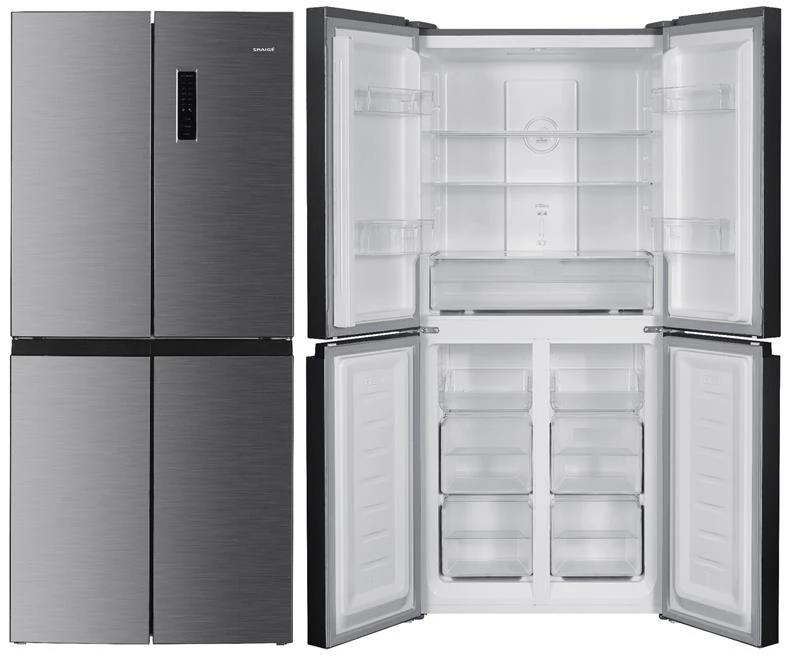 Багатодверний холодильник Snaige MRF30FB-P5CB2EH у виконанні з нержавіючої сталі має загальний об’єм 362 л (237 л холодильне відділення + 125 л морозильне). Чотири двері та система No Frost в обох камерах спрощують щоденне користування без ручного розморожування. Електронне керування з індикаторами та сигналом відчинених дверей доповнюється світлодіодним освітленням. Річне споживання енергії становить 262 кВт·год за класу E. Рівень шуму 39 дБ(A) робить роботу пристрою малопомітною навіть у відкритій кухні.