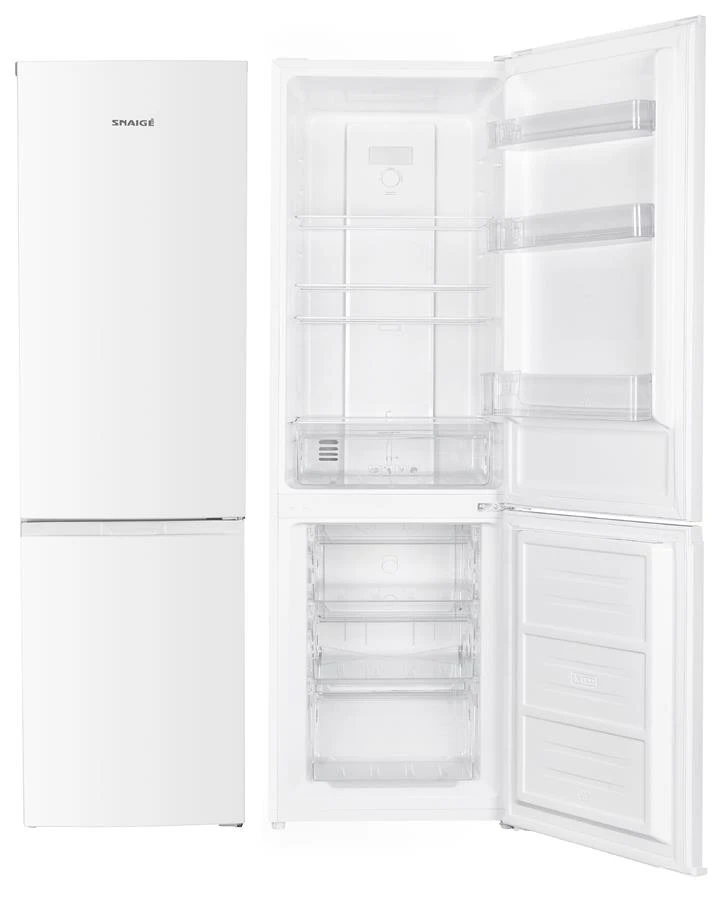 Snaige RF63FG-P5002EH — двокамерний холодильник із нижньою морозильною камерою та системою NoFrost в обох відділеннях загальним об'ємом 253 л. Холодильне відділення на 182 л із трьома скляними полицями та відсіком для овочів зберігає продукти в діапазоні 2–8 °C, морозильна камера на 71 л підтримує температуру до -22 °C із рейтингом 4 зірки. Механічне керування з регульованим термостатом забезпечує просте та надійне налаштування. Компактна ширина 54 см, перенавішування дверей і регульовані передні ніжки спрощують встановлення в будь-якому приміщенні.