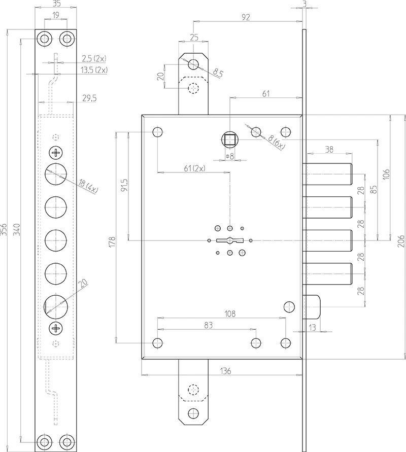 - Габариты лицевой части замка 35х356 мм