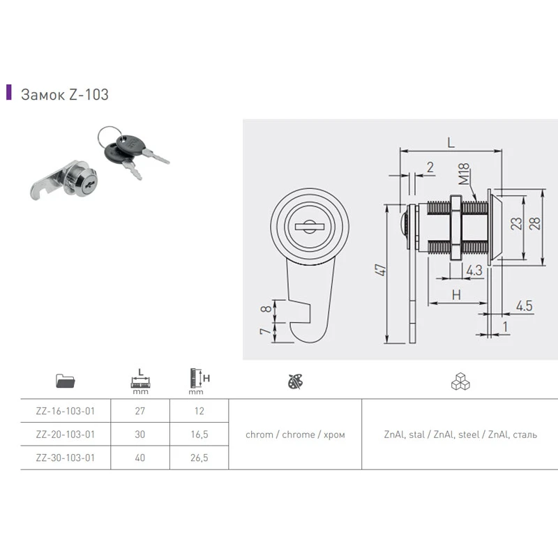 Основное о модели — Замок GTV ZZ-30-103-01-S для ящиков, цилиндр 30 мм, Хром