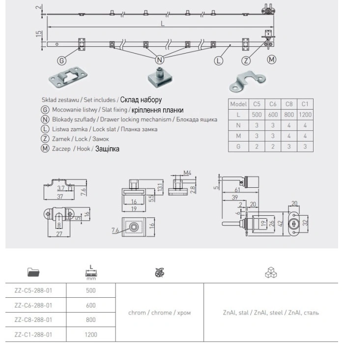Механизм предназначен для установки в тумбы с несколькими ящиками. Перед монтажом необходимо точно выровнять тяги для корректного функционирования центрального блокирования. В комплект входят ключи и монтажные элементы.