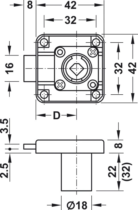 - Цилиндр диаметром 18 мм — стандартное врезное крепление