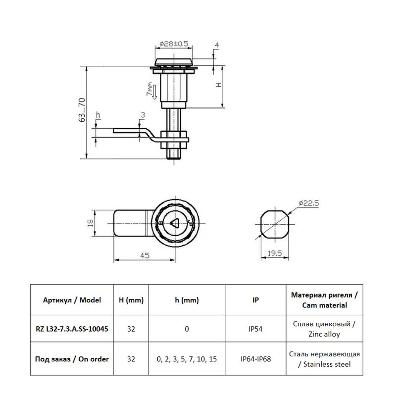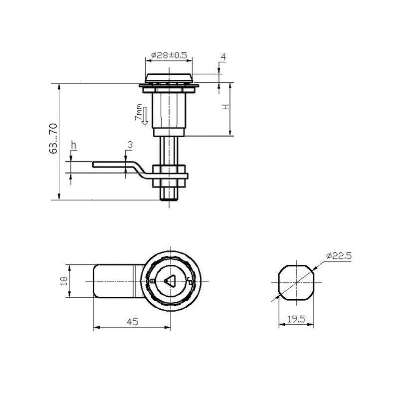 Перед установкой проверьте размер посадочного отверстия (примерно 19,5×22,5 мм) и толщину панели. Замок монтируется с внутренней стороны корпуса при помощи фиксирующей гайки. Не перетягивайте гайку, чтобы не деформировать уплотнитель. Для стабильной работы рекомендуется регулярно очищать механизм и смазывать подвижные элементы.