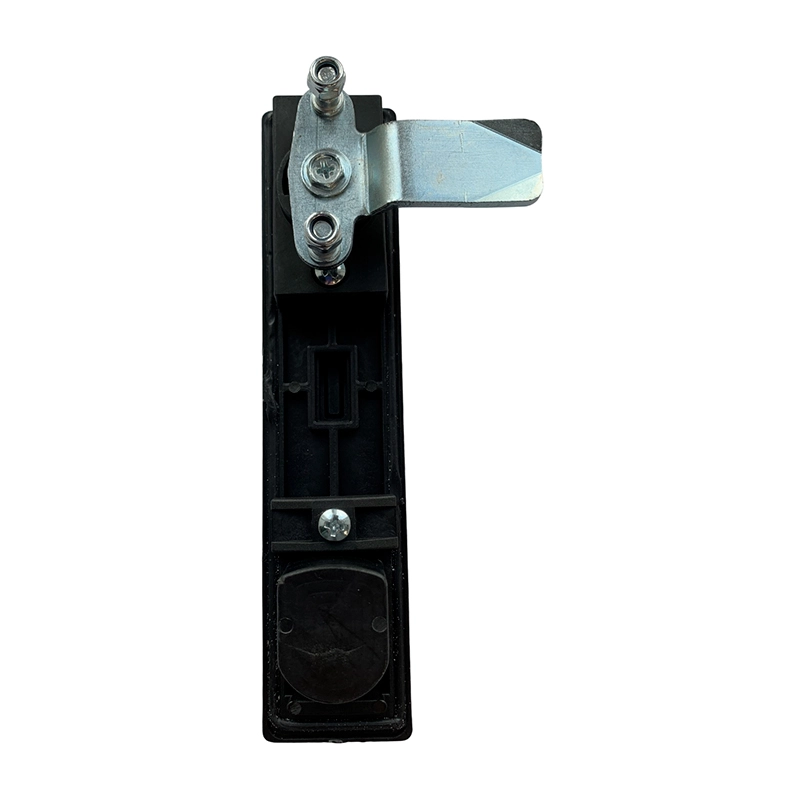 Замок с поворотной рукояткой без тяг в черном цвете — это компактный врезной запорный механизм для металлических шкафов и корпусов, предназначенный для односторонней блокировки дверей. Изготовлен из ударопрочного полиамида, оснащен кривым ригелем с изгибом 7 мм для фиксации в одной точке запирания. В комплекте: корпус с рукояткой, ригель и вставка под английский ключ (с одним ключом). Работает по принципу поворота рукоятки на 90°: ручка блокирует ригель, обеспечивая простое запирание без дополнительных тяг — подходит для базовой защиты в ограниченном пространстве.