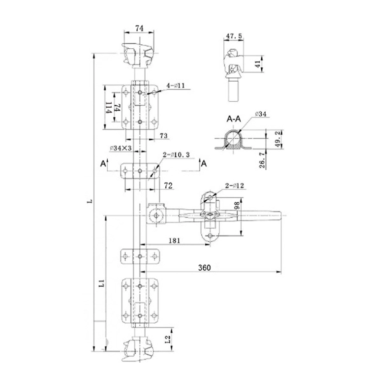Замок совместим с системами, использующими трубу или стержень диаметром 34 мм. Его можно сочетать с петлями, ручками, кронштейнами и уплотнителями дверей полуприцепов и фургонов. Для долговечной эксплуатации рекомендуется использовать оцинкованный или нержавеющий крепёж.