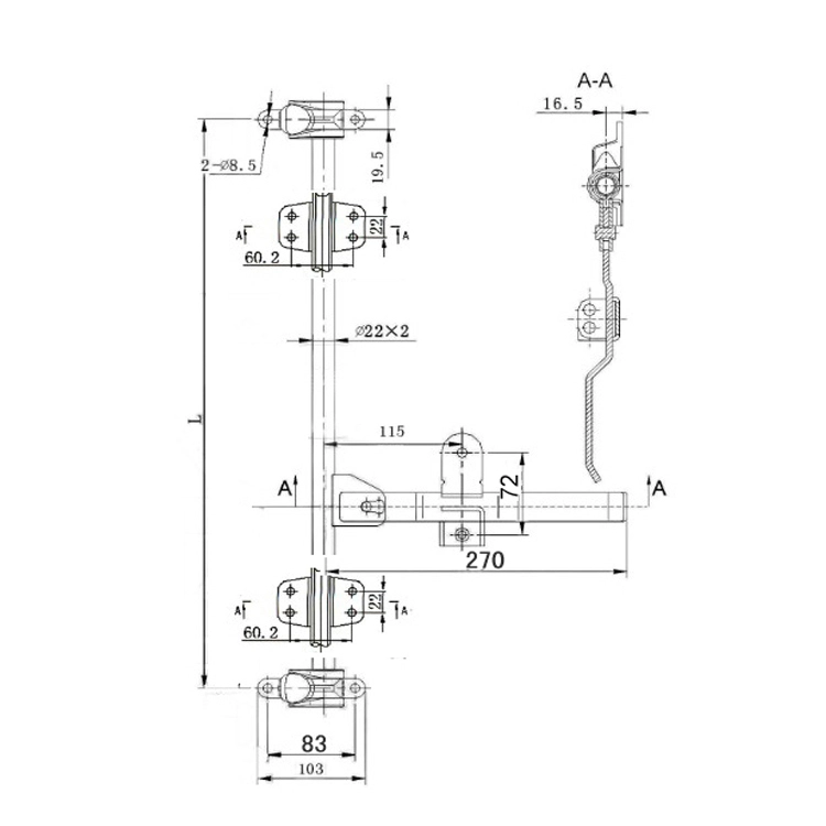 Замок подходит для систем, использующих трубу или стержень диаметром 22 мм. Совместим с петлями, ручками, кронштейнами и уплотнителями, применяемыми в транспортных дверных механизмах. Рекомендуется использовать оцинкованные крепёжные элементы для увеличения срока службы.