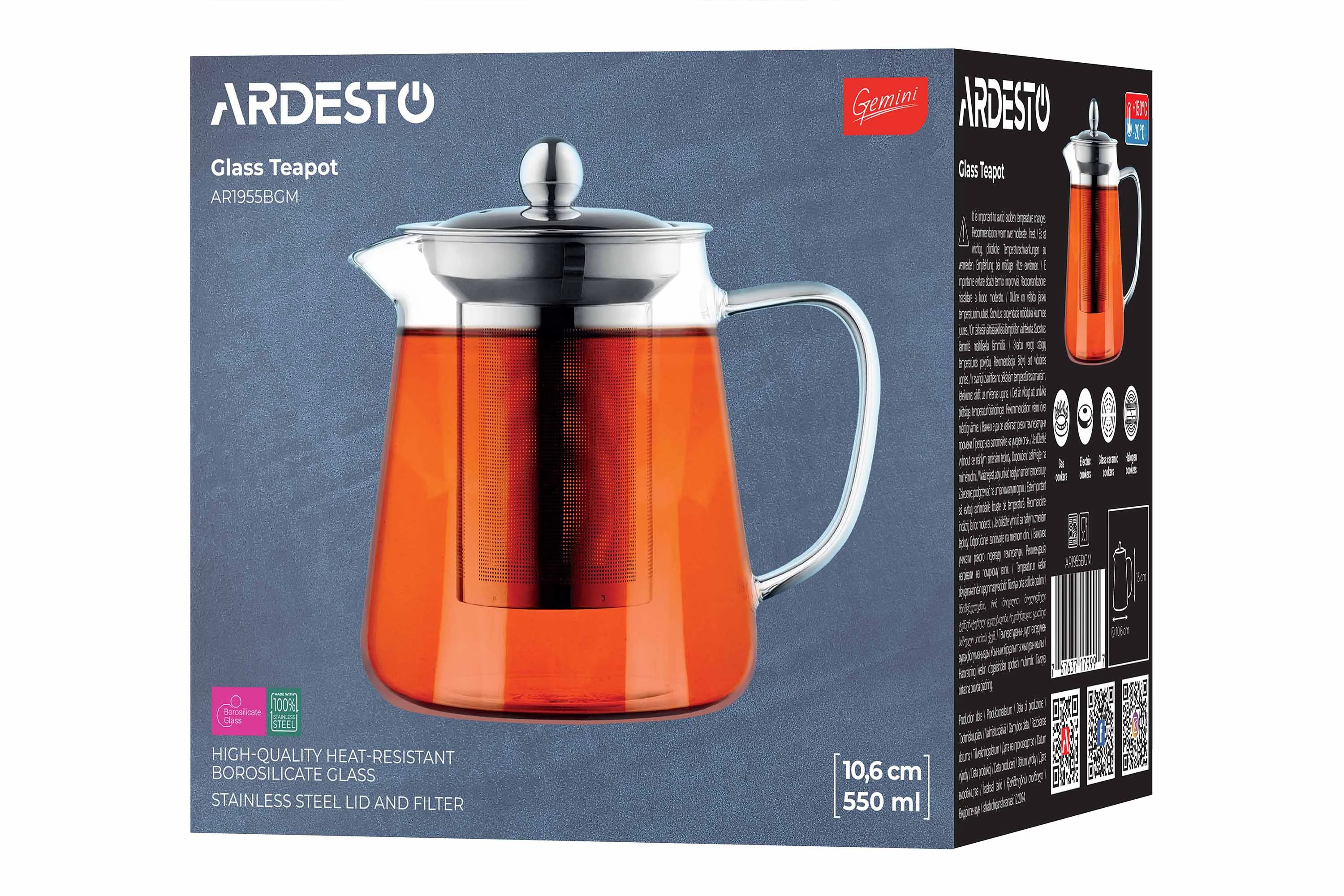 Заварник виготовлено з екологічного матеріалу – боросилікатного скла, яке не вбирає запахи, тому смак чаю завжди залишатиметься незмінним. Матеріал вирізняється міцністю і стійкістю до перепадів температури, тож тривалий термін слугування і безпечне використання виробу гарантовано. Зручне ситечко з нержавіючої сталі надійно утримує всередині чайне листя. Об’єму 550 мл достатньо для чаювання на двох. Заварник згодиться для різних видів плит (газових, електричних, склокерамічних, галогенних), його можна підігрівати на помірному вогні та мити в посудомийній машині.